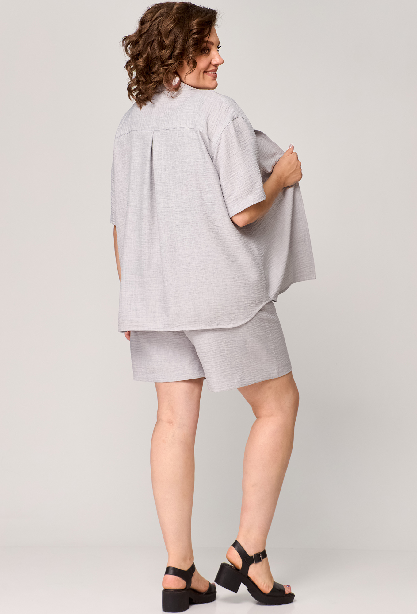 Костюм состоящий из рубашки и шорт, выполнен из однотонной ткани.