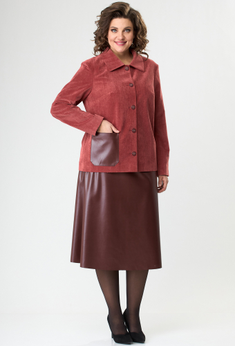 Костюм состоящий из жакета и юбки. Жакет полуприлегающего силуэта. Полочка жакета с центральной застежкой на четыре петли и пуговицы, вертикальными рельефами, нагрудной вытачкой. Горловина круглой формы. Спинка со средним швом и вертикальными рельефами. Рукав длинный втачной, двухшовный. Жакет на подкладке. Юбка классическая, облегающая бедра и зауженная к низу, на подкладке, длиной слегка за колено. Передняя часть юбки с талиевыми вытачками, задняя часть также с талиевыми вытачками и средним швом, в верхней части которого обработана потайная молния, в нижней части шлица. Пояс юбки притачной, с эластичной тесьмой и застежкой на петлю и пуговицу. Юбка на подкладке.
