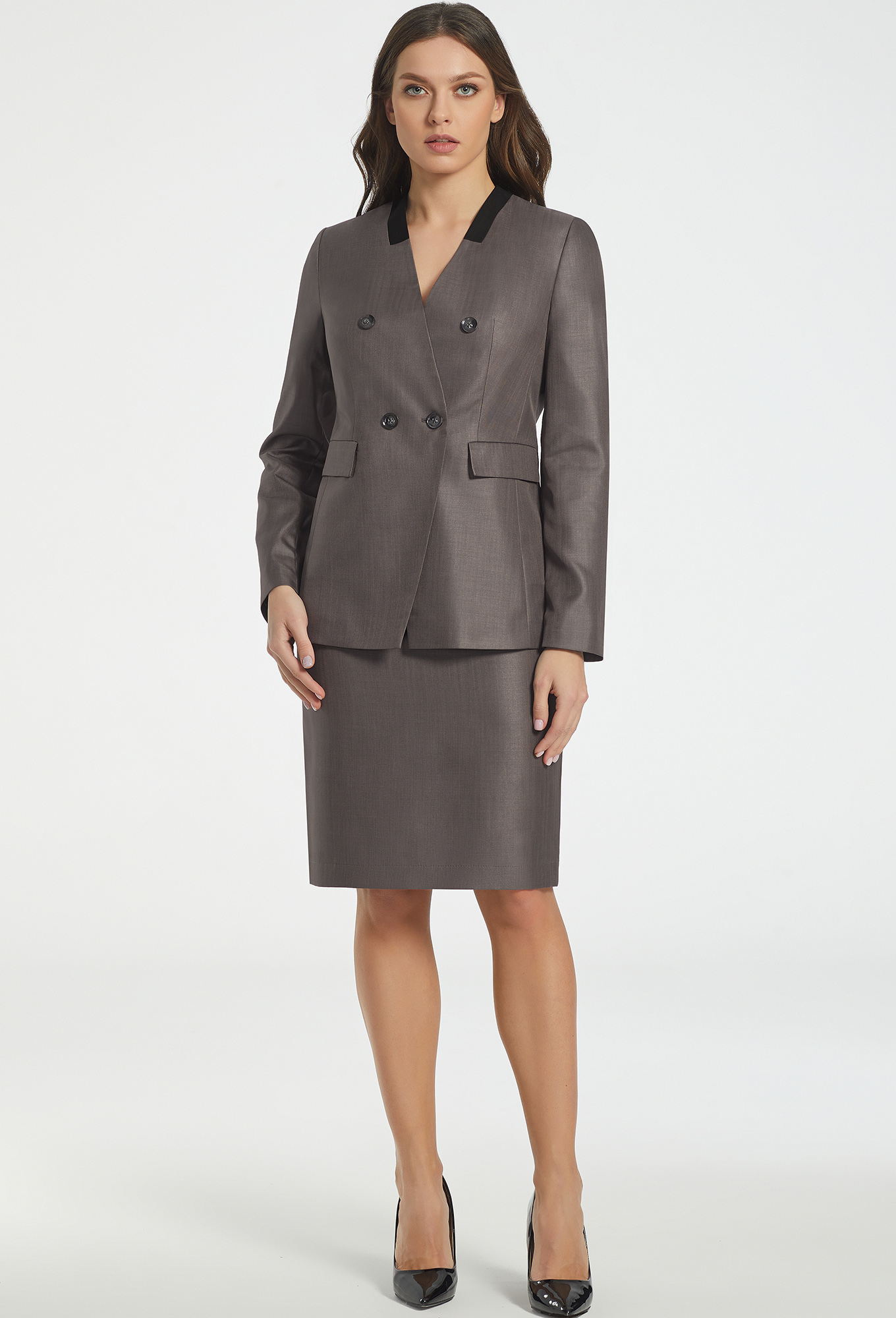 Комфортный двубортный жакет с застежкой на петли и пуговицы. Перед с V-образным вырезом горловины и фигурной формой борта, двумя горизонтальными карманами с клапанами и контрастной деталью в области горловины. Рукава втачные двушовные с контрастными нижними частями, на подкладке.