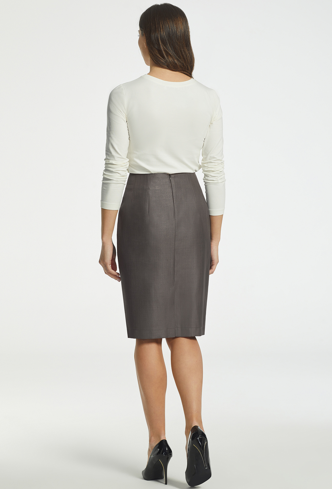 Юбка карандаш на обтачке, в среднем шве спинки обработана потайная молния и шлица, на подкладке.