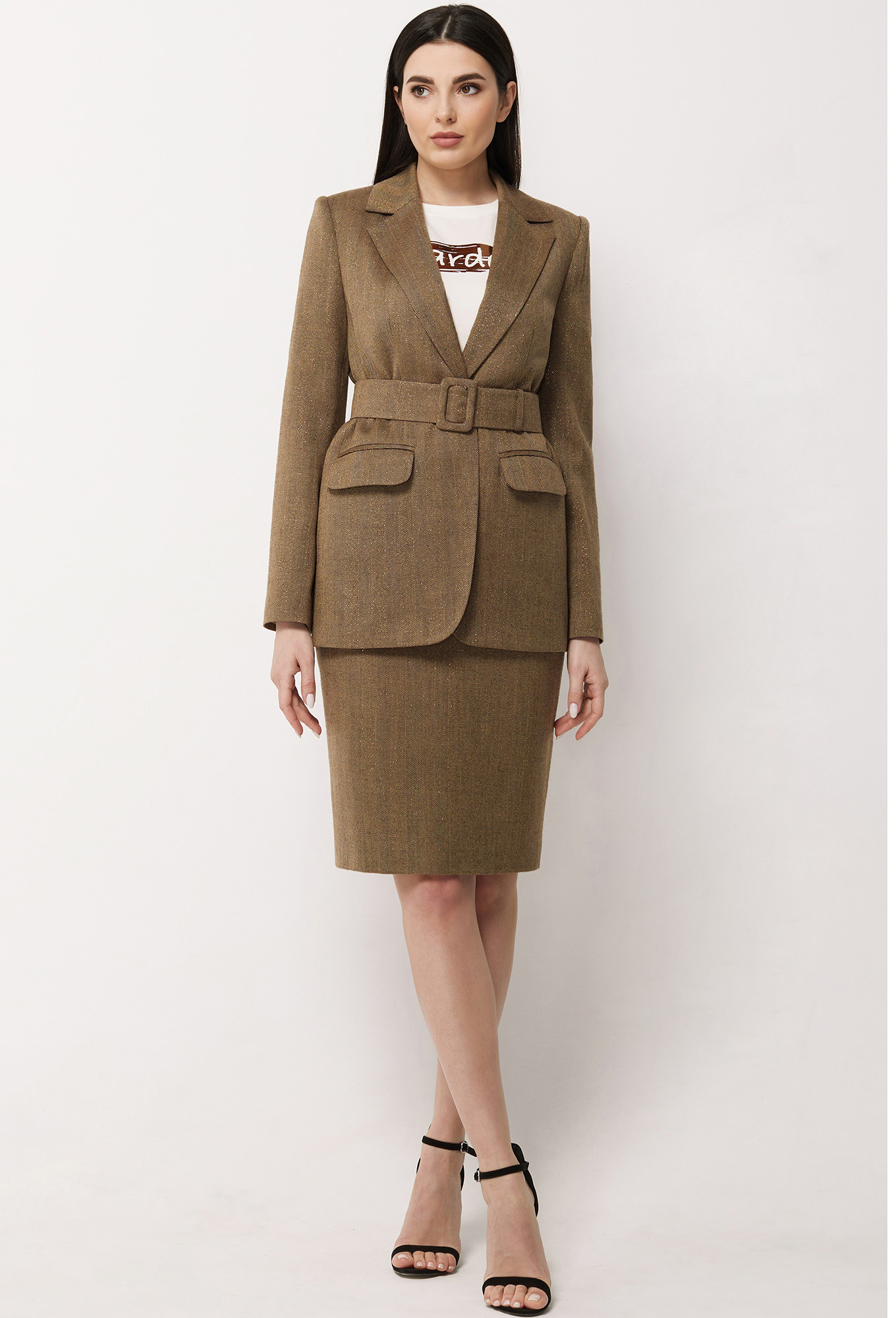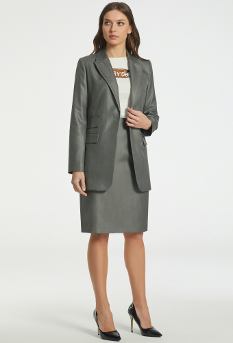 Комфортный однобортный жакет. Перед с центральной застежкой на петлю и пуговицу и двумя горизонтальными карманами с рамками и клапанами. Средний шов спинки заканчивается шлицей. Рукава втачные двушовные. Воротник отложной с лацканами. Линия талии подчёркивается поясом с пряжкой из основной ткани. На подкладке.