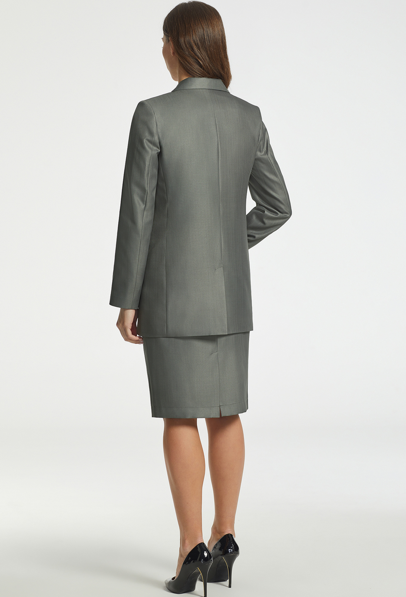 Однобортный жакет прямого силуэта с застежкой на петлю и пуговицу. Перед с двумя карманами с рамками и клапанами и одним карманом-обманкой с рамками и клапаном. Средний шов спинки заканчивается шлицей. Рукава втачные двушовные. Воротник отложной с лацканами. На подкладке.