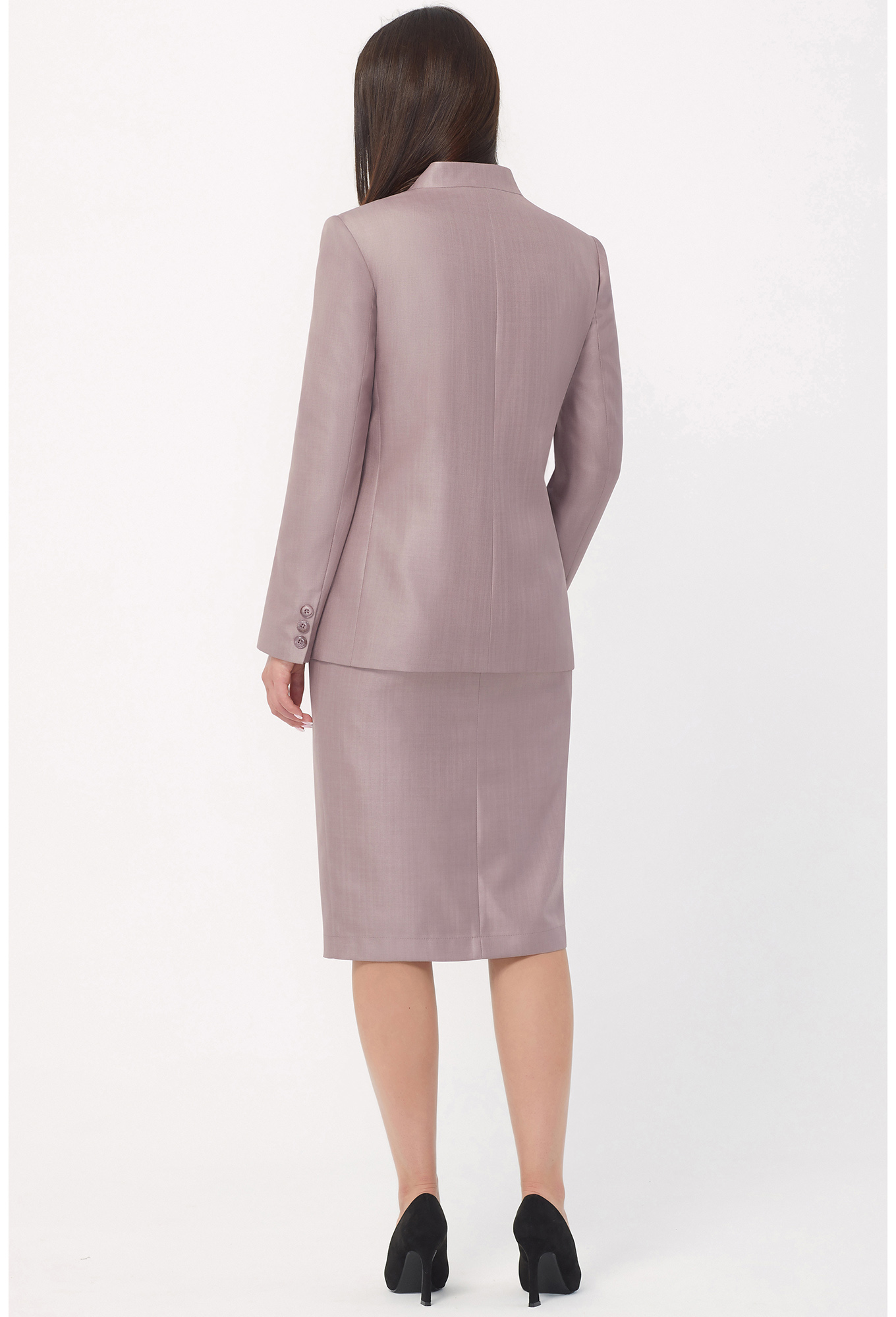 Стильный однобортный жакет полуприлегающего силуэта станет удачным вложением в гардероб: утром он сформирует образ для офиса, а вечером, благодаря интересному крою, в нём можно отправиться на светское мероприятие. Изделие, с запоминающимся вырезом горловины, который получился при сочетании широких лацканов и стойки с закруглёнными концами. Перед с центральной застёжкой на петли и пуговицы с косыми выточками, в которых обработаны карманы с небольшими клапанами. Рукава втачные двухшовные с декоративными шлицами с отделочными пуговицами. На подкладке.