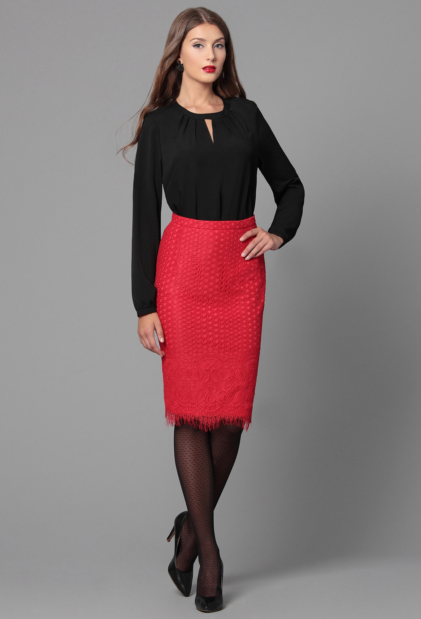 Юбка – прямая, без подкладки. Заднее полотнище юбки со средним швом, заканчивающимся разрезом; с застежкой в среднем шве "молния". Стрейч.  Длина юбки 65 см.