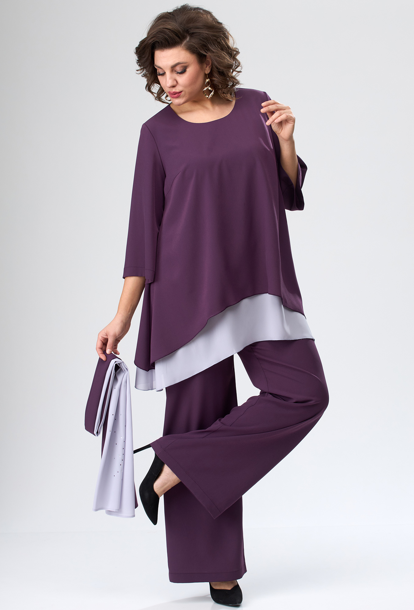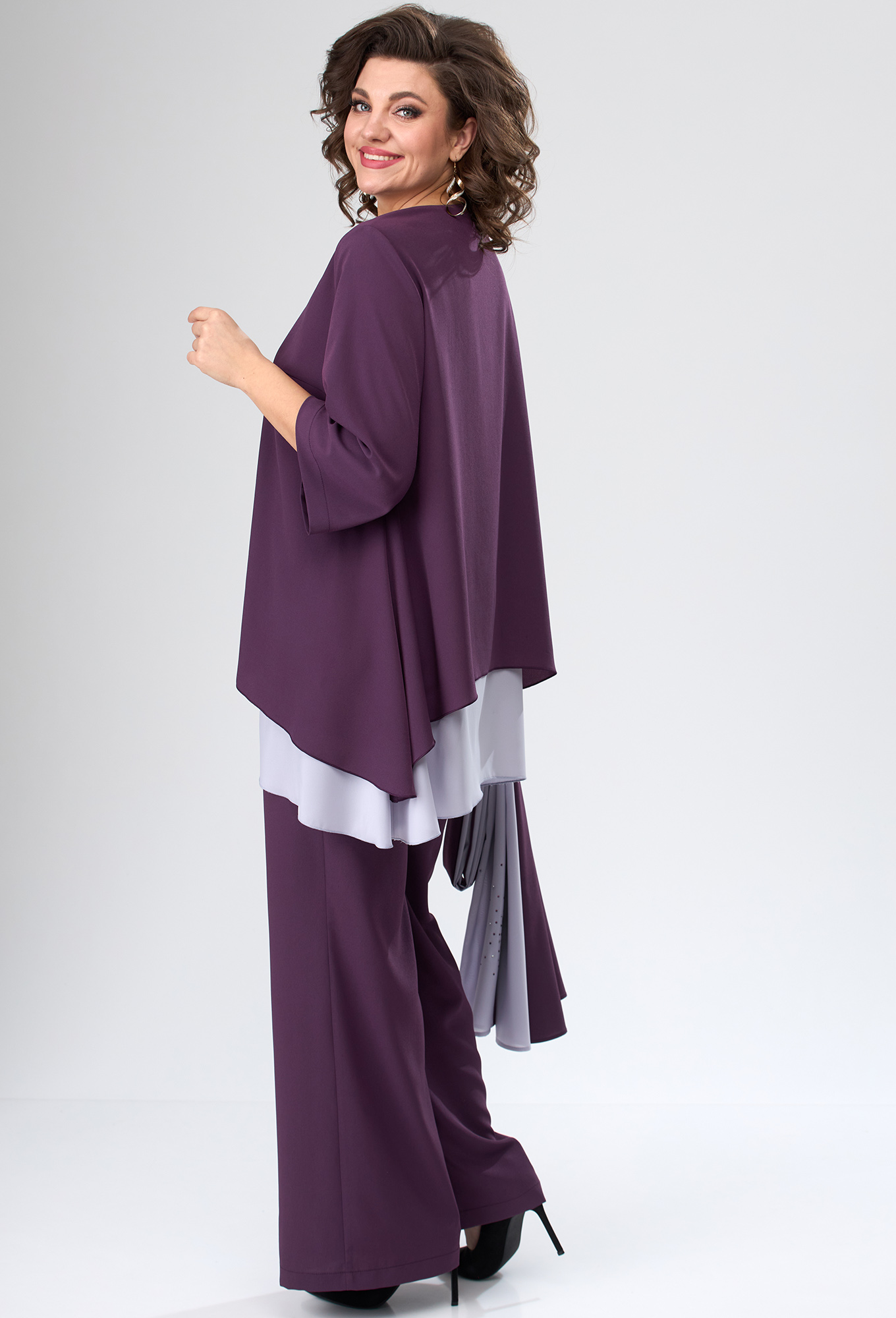 Костюм состоит из шарфа, блузки и брюк. Костюм выполнен из однотонной ткани, в качестве отделки использован однотонный шифон. Блузка А-образного силуэта, двухлойная. Полочка блузки с нагрудными вытачками, горловиной круглой формы. Спинка со средним швом. Рукав длиной ¾, втачной, одношовный. Низ блузки ассиметричный, с удленеными углами боковых швов.