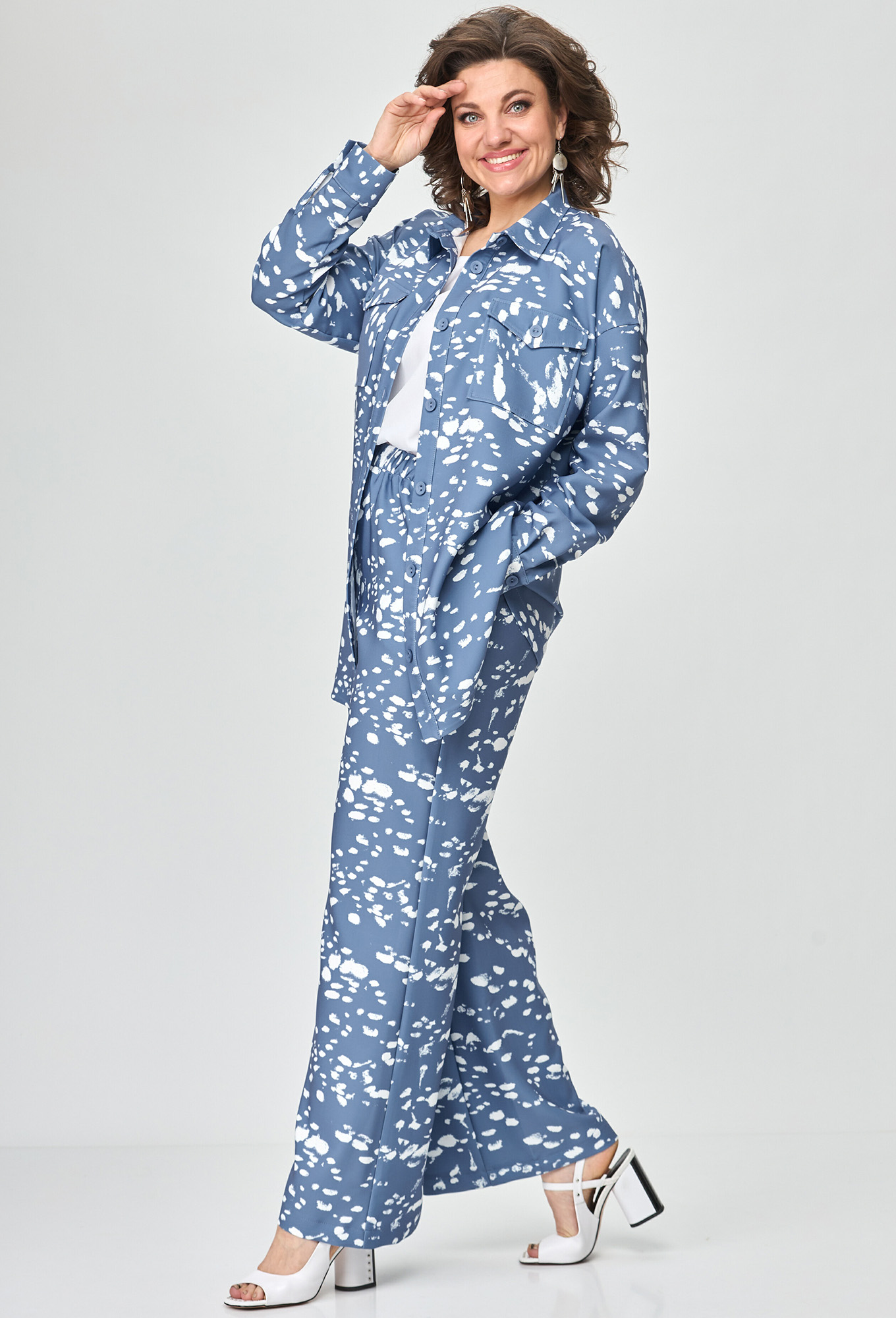 Костюм выполнен из ткани с набивным рисунком. Костюм состоит из рубашки и брюк. Рубашка прямого силуэта.