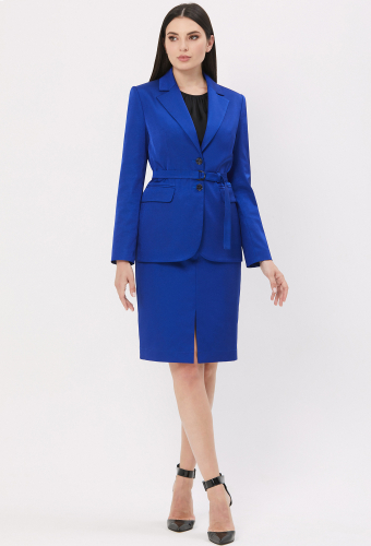 Асимметрия как модный тренд сейчас очень актуальна. И если на симметричном образе наш глаз отдыхает и здесь все понятно и привычно, то асимметрия всегда привлекает внимание, создает динамику, придаёт образу остроту. Комплект женский состоящий из жакета и юбки. Жакет полуприлегающего силуэта на подкладке. По переду и спинке фигурные рельефы,в рельефах переда функциональные карманы в рамку с клапаном. Застежка асимметричная (сверху двубортная,снизу однобортная) бортовая застегивающаяся на петли и декоративные пуговицы. Воротник пиджачного типа. Рукав втачной двухшовный длинный. Низ изделия фигурный с выступом у застежки. Юбка полуприлегающего силуэта на подкладке зауженная к низу на обтачке( без пояса), По переду асимметричный подрез имитирующий застежку с петлями и декоративными пуговицами. В подрезе переда шлица, застежка на потайную тесьму-молнию в левом боковом шве.
