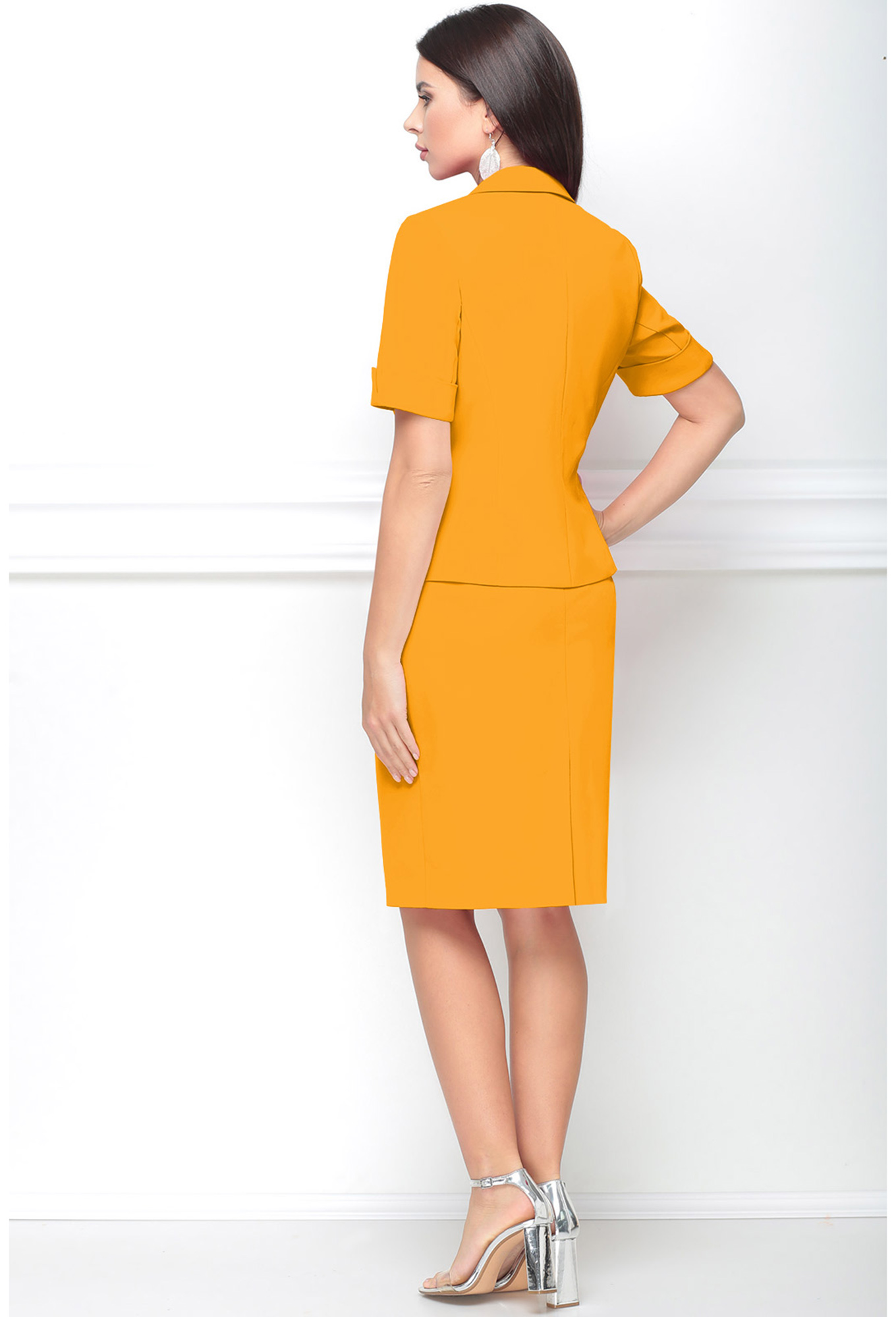 Комплект женский комплектация: жакет и юбка. Жакет полуприлегающий на хлопковой подкладке. По переду функциональные карманы в рамку с клапаном. Воротник пиджачного типа с фигурным бортом и двухбортной застежкой на две петли и пуговицы. Рукав втачной короткий с притачным отложным манжетом. Юбка полуприлегающего силуэта на подкладке без пояса (на обтачке). По переднему полотнищу функциональные карманы-хулиганы. Застежка на потайную тесьму-молнию в среднем шве заднего полотнища и шлицей. В комплект входит съемный пояс из основной ткани.