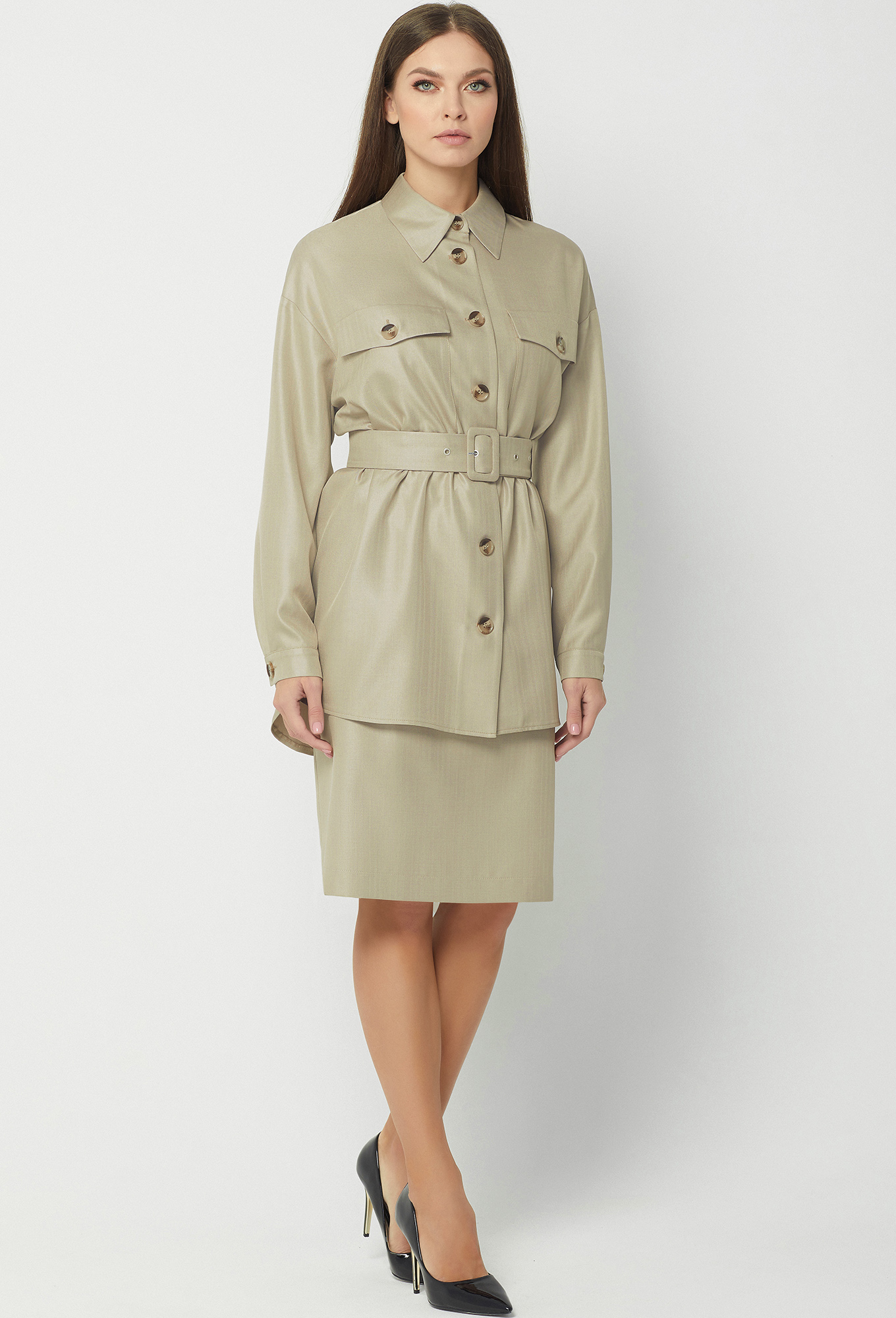 Жакет свободного кроя, со спущенной линией плеча и разным уровнем низа переда и спинки. Перед с центральной застежкой на петли и пуговицы и двумя накладными карманами с клапанами и декоративными пуговицами. Рукава рубашечного типа с манжетами и застёжкой на петли-пуговицы. Воротник отложной с отрезной стойкой. Дополняется поясом с пряжкой из основной ткани.
