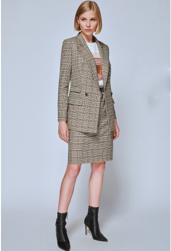 Двубортный удлинённый жакет с застёжкой на петли-пуговицы. Перед с двумя карманами-обманками с рамками и двумя прорезными карманами с клапанами и листочками. Рукава втачные двухшовные, передние швы со шлицами и отделочными пуговицами. Воротник отложной с широкими лацканами. На подкладке