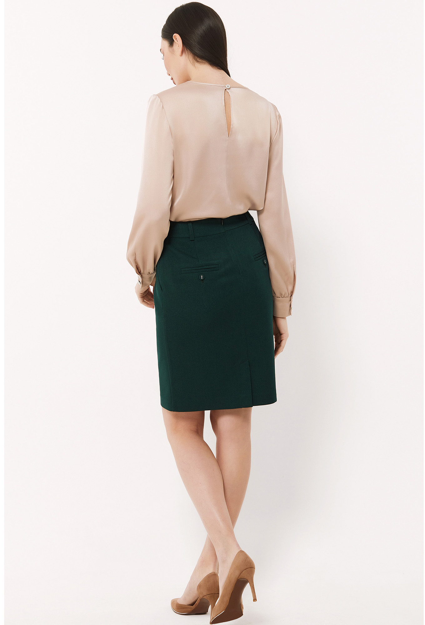 Красивая юбка на притачном поясе со шлёвками. Передняя половинка с косыми карманами. Задняя половинка с двумя карманами-обманками с отделочными пуговицами, с застёжкой на потайную молния и шлицей. На подкладке.