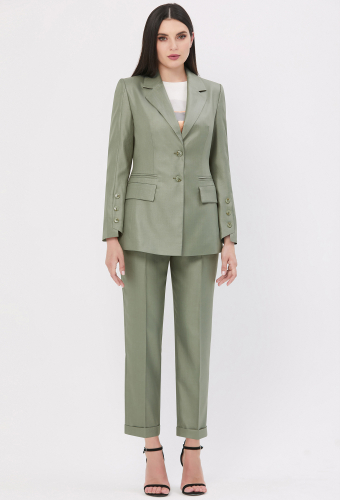 Стильный однобортный жакет полуприлегающего силуэта, выполненный из жаккардовой ткани с интересным рисунком, будет эффектно смотреться как и с однотонными вещами, так и с вещами в одной гамме. Перед с глубоким V-образным вырезом горловины, с застёжкой на две петли-пуговицы и с двумя функциональными карманами с рамками. Рукава втачные двушовные с декоративными шлицами и отделочными пуговицами. На подкладке.