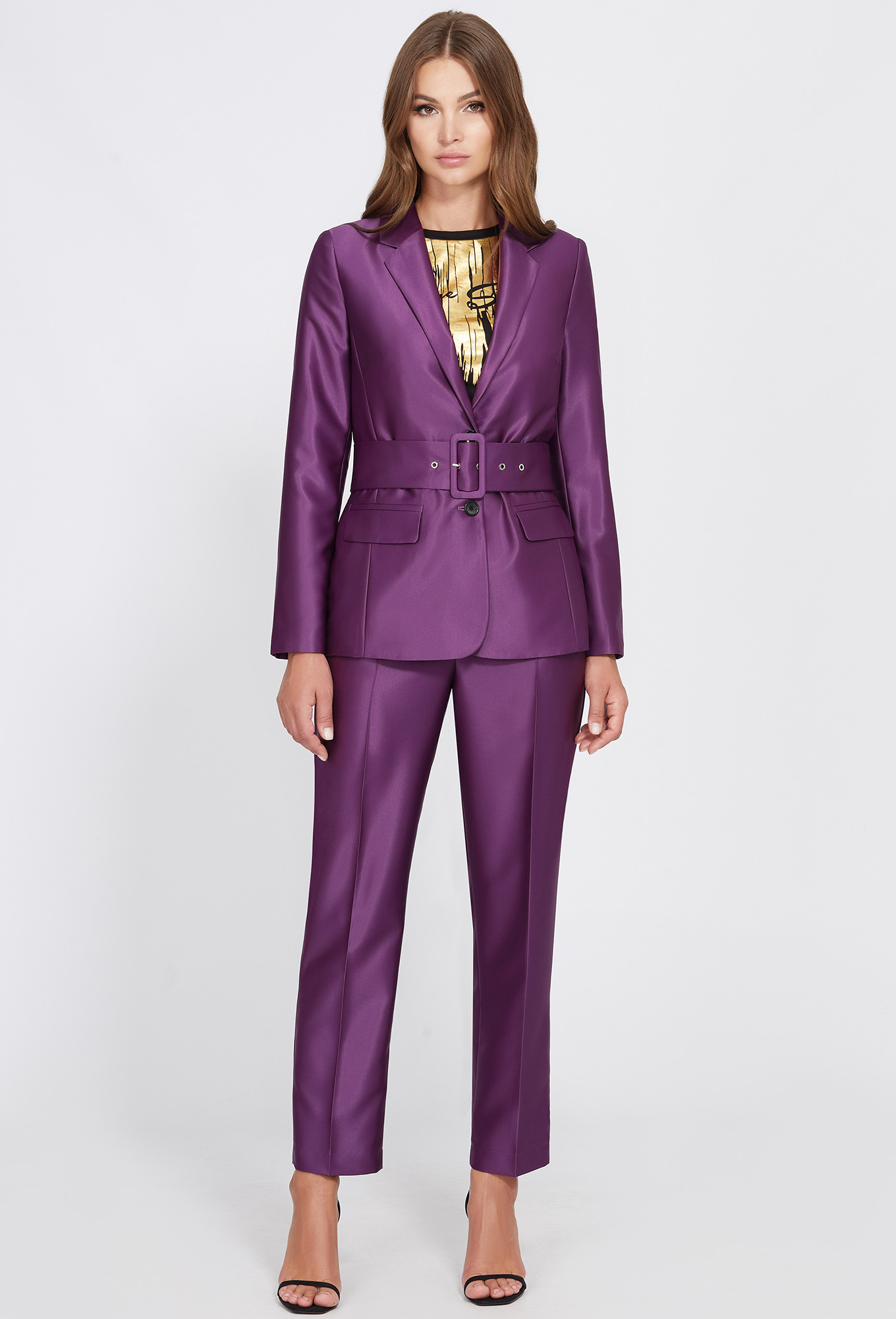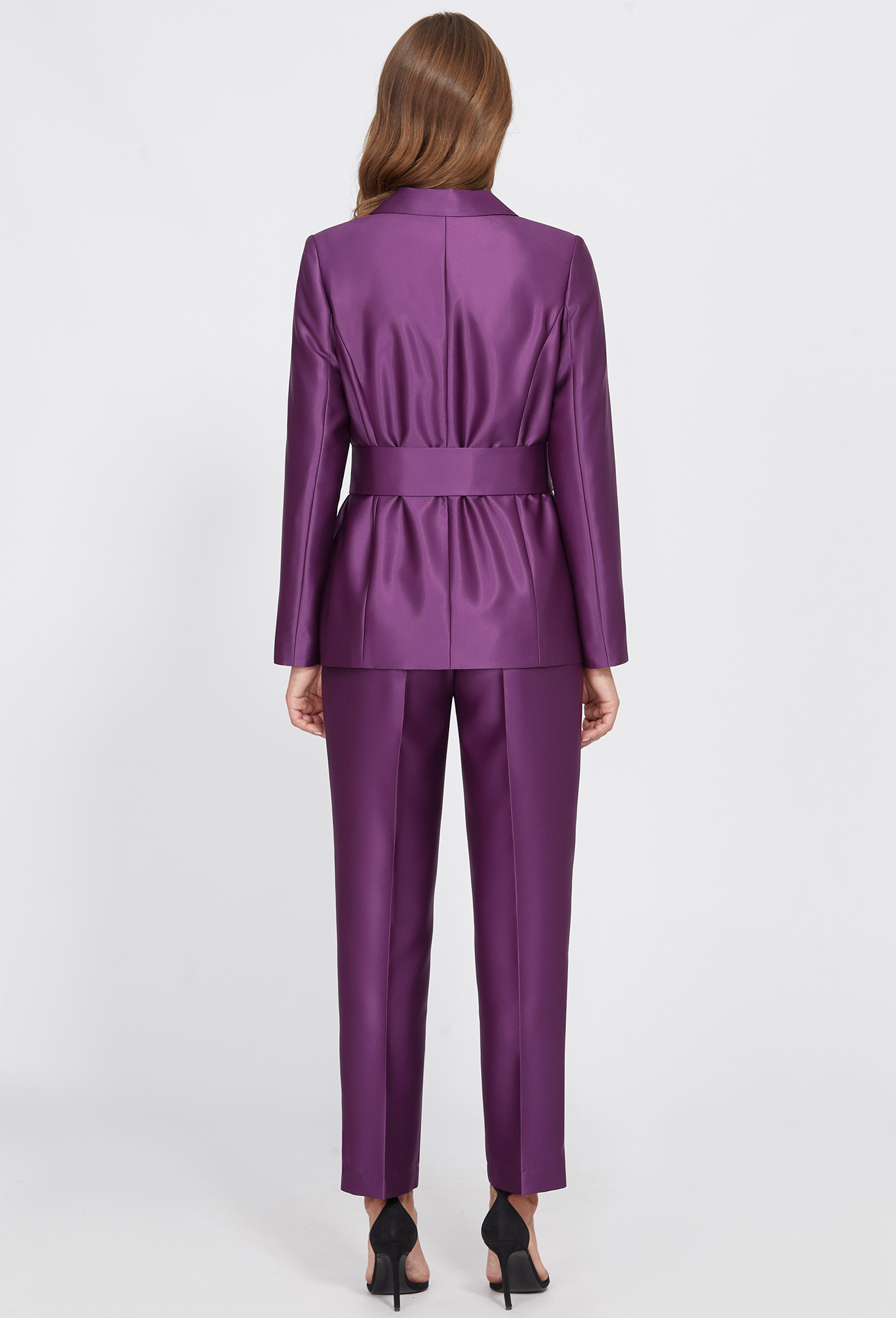 Жакет полуприлегающего силуэта с центрально-бортовой застёжкой на две петли-пуговицы. Перед с горизонтальными параллельными клапанами и рамками. Рукава втачные двухшовные. Воротник отложной с лацканами. На подкладке. Дополняется широким поясом с пряжкой из основной ткани.