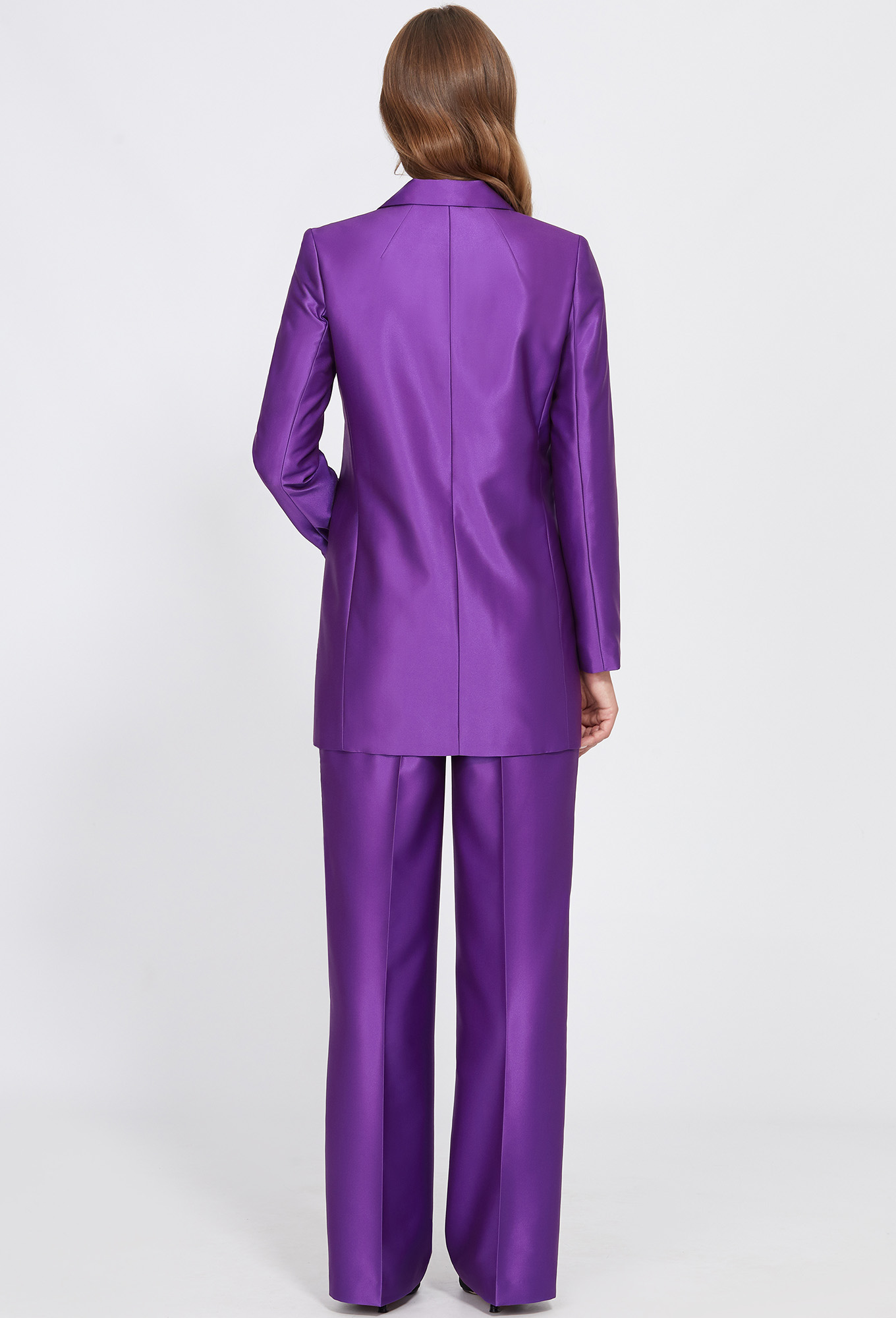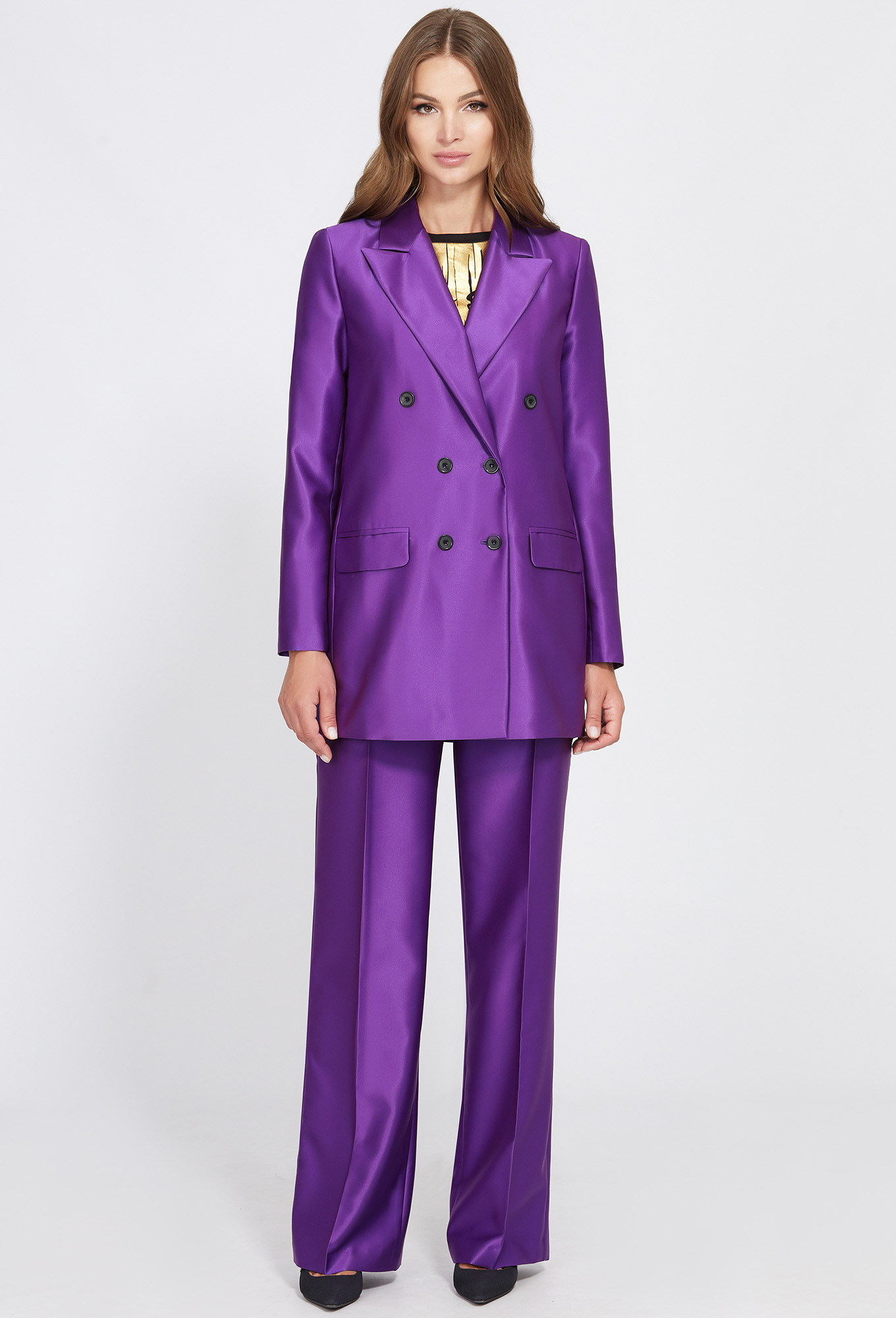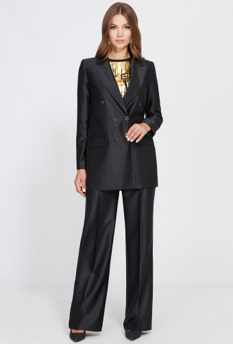 Удлинённый двубортный жакет прямого силуэта с застёжкой на петли, пуговицы бочком. Перед с горизонтальными карманами с рамками и клапанами. Спинка со средним швом. Рукава втачные двухшовные со шлицами и декоративными пуговицами. Воротник отложной с лацканами. Жакет на подкладке с плечевыми накладками.