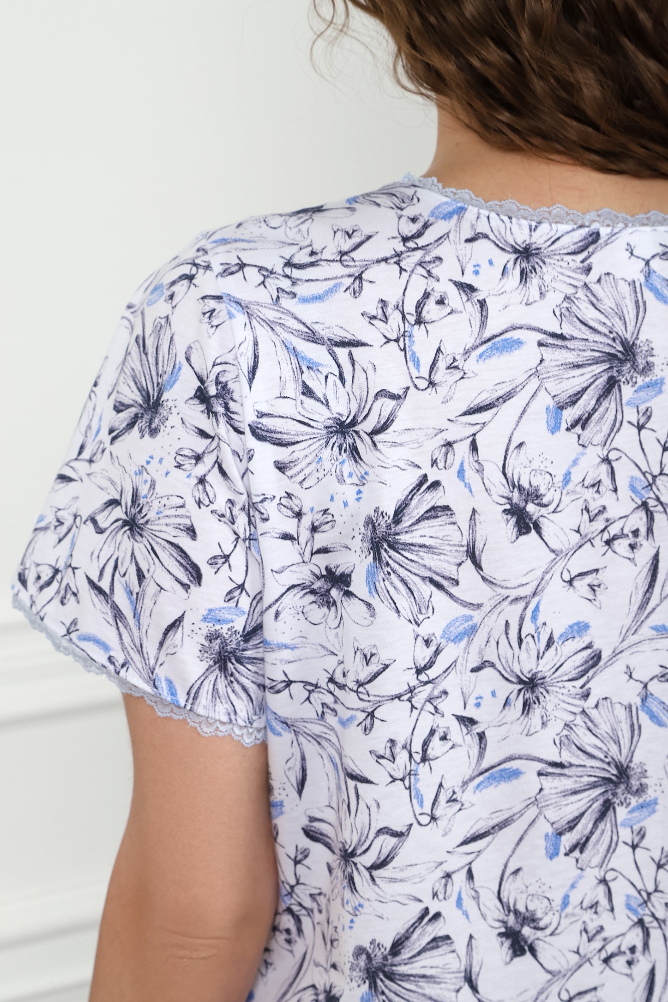 Сорочка женская из трикотажного полотна «кулирка» с набивным рисунком, свободного покроя, слегка расширенная книзу, с короткими втачными рукавами и горловиной овальной формы. Полочка – с отделочной деталью, повторяющей контур горловины, в шве притачивания которой симметрично относительно центра заложены 6 складочек-защипов. Наружный край горловины и низ рукавов обработаны узким кружевом.