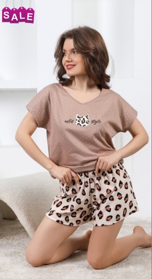 Пижама из трикотажного полотна «кулирка» в комбинации с трикотажным полотном «махра» с набивным рисунком в единой цветовой гамме, состоящая из футболки и шорт. Футболка – из гладкокрашеного полотна «кулирка», классического покроя, с короткими цельнокроеными рукавами, горловиной v- образной формы, окантованной основным материалом. На полочке принт, выполненный в технике «шелкографии».Шорты – из полотна «махра», средней длины, расширенные книзу с эластичной тесьмой по талии.