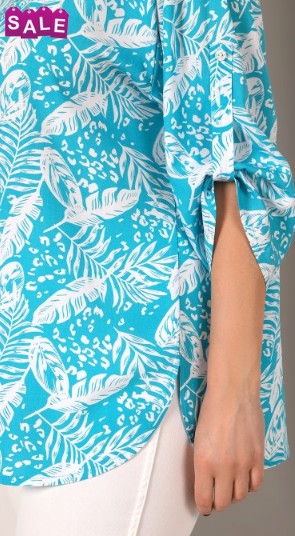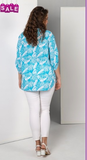 Туника женская из тканого штапельного полотна с набивным рисунком, стояче-отложным воротником, без застежки, фигурным низом, горловиной v-образной формы, втачными рукавами длиной ¾, задрапированными при помощи пат с пуговицами.