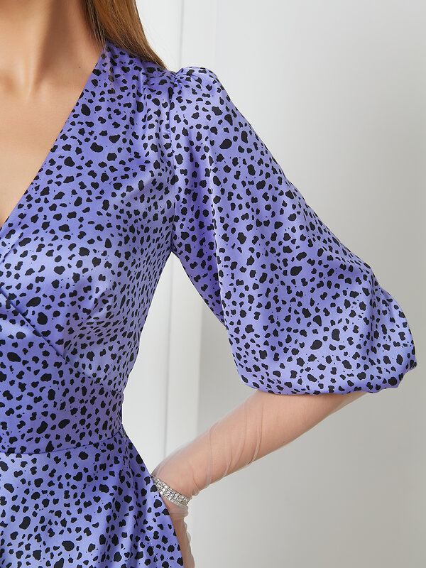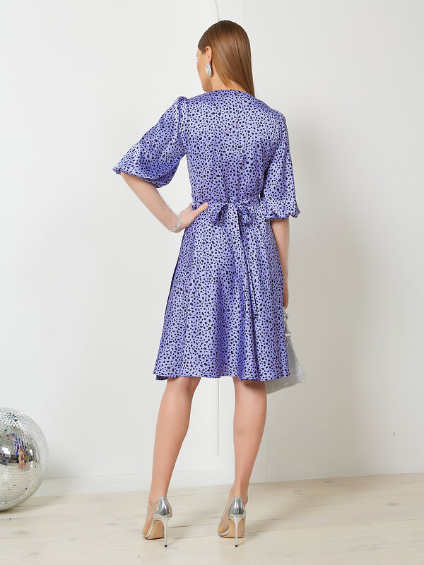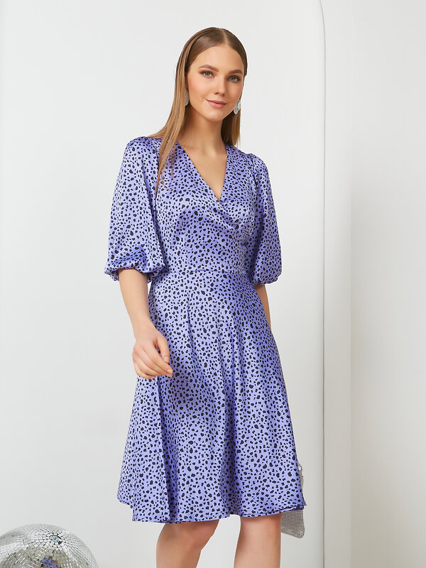 Модель с отрезной линией талии, с зап?хом и полупоясом, который завязывается сзади. По окату рукава сборка, низ собран на резину.