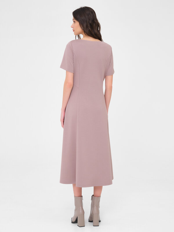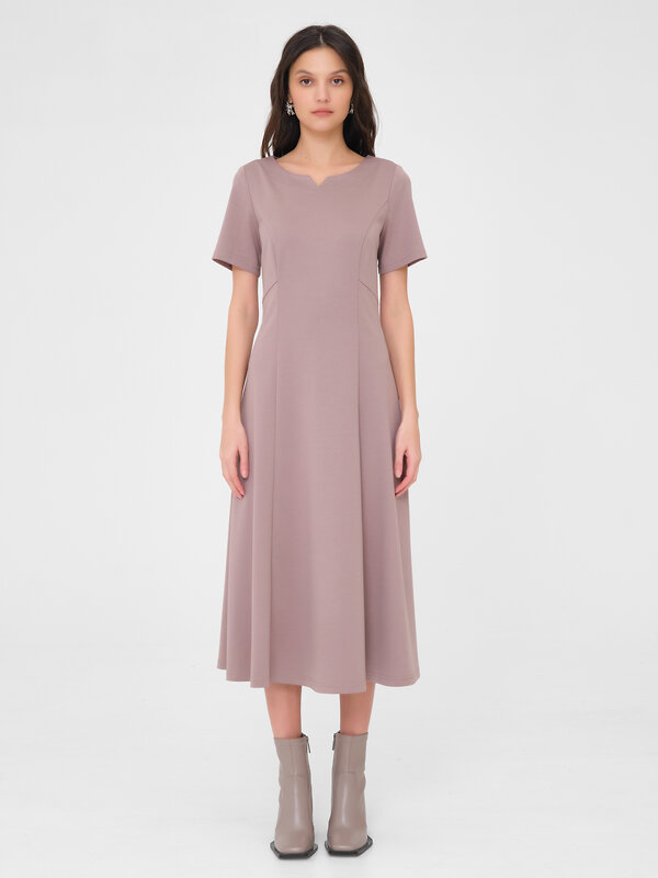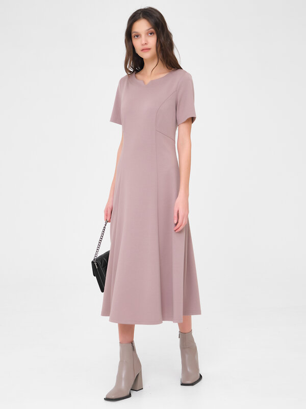 Модель с рельефами и наклонными подрезными бочками. Спереди по горловине фигурный вырез. Платье декорировано отделочными строчками. Ремень в комплект не входит.