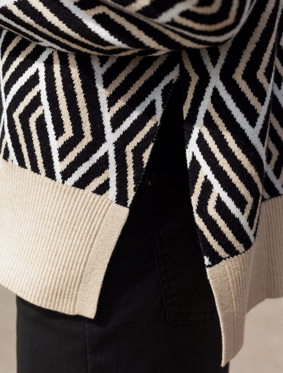 Свитер жаккардовой вязки выполнен из нежной пряжи на основе вискозы с добавлением кашемира. Свободная модель со спущенным плечом дополнена боковыми разрезами, что делает образ еще более расслабленным. Совет стилиста: такой джемпер может стать ключевым акцентом в сдержанном комплекте. Выбирайте однотонные низы в тон широкой рибаны или на контрасте. черный-бежевый