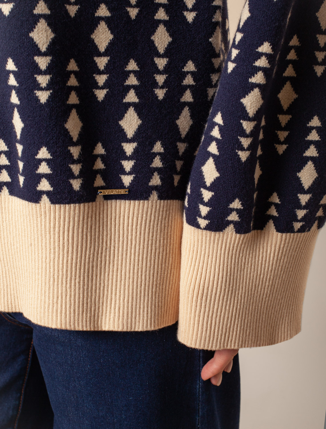 Свитер жаккардовой вязки выполнен из нежной пряжи на основе вискозы с добавлением кашемира. Свободная модель со спущенным плечом дополнена боковыми разрезами, что делает образ еще более расслабленным. Совет стилиста: такой джемпер может стать ключевым акцентом в сдержанном комплекте. Выбирайте однотонные низы в тон широкой рибаны или на контрасте. синий-бежевый
