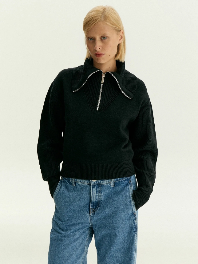 Укороченный и приталенный джемпер на молнии с воротником "апаш" придаст особый шарм кэжуальным образам. Низ, выполненный резинкой, создаёт красивый переход от объема к прилеганию. Два типа вязки вносят визуальное разнообразие, а чёрный цвет обеспечивает широкую сочетаемость. Материал наполовину состоит из вискозы, что делает его дышащим и комфортным, а благодаря нейлону джемпер защищает от холодного ветра, хорошо держит цвет и быстро сохнет