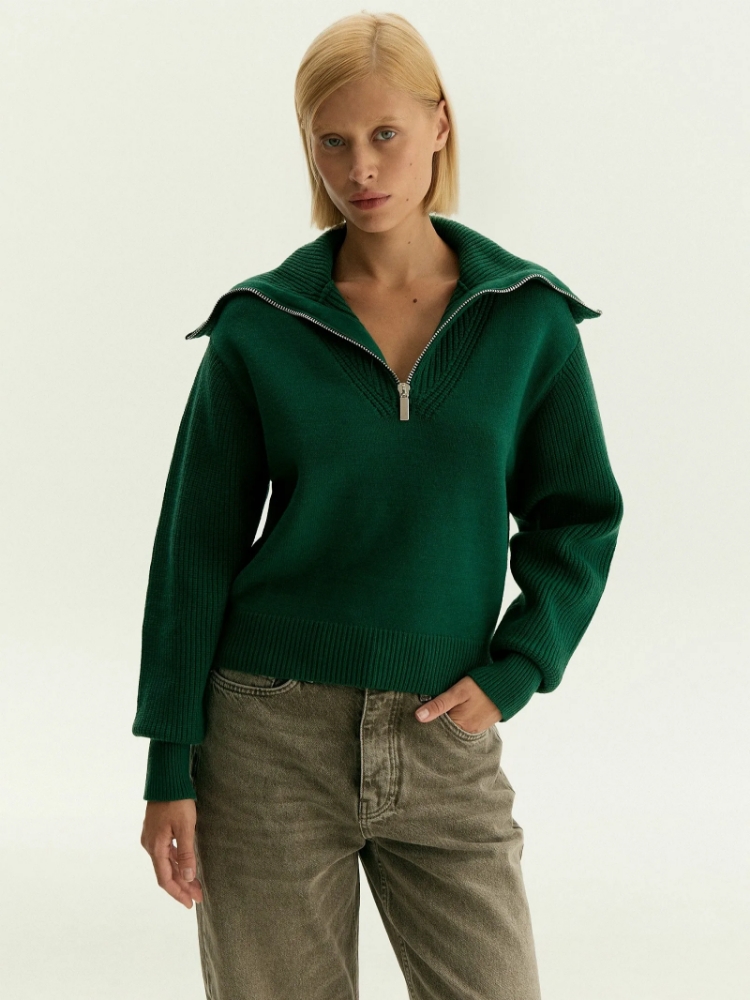 Укороченный и приталенный джемпер на молнии с воротником "апаш" придаст особый шарм кэжуальным образам. Низ, выполненный резинкой, создаёт красивый переход от объема к прилеганию. Два типа вязки вносят визуальное разнообразие, а зелёный цвет ставит яркий трендовый акцент. Материал наполовину состоит из вискозы, что делает его дышащим и комфортным, а благодаря нейлону джемпер защищает от холодного ветра, хорошо держит цвет и быстро сохнет