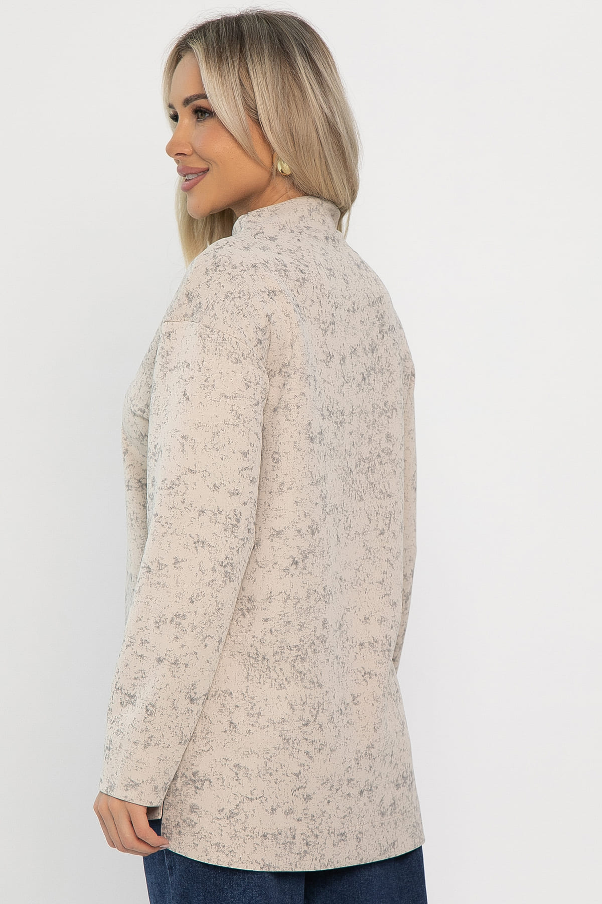 Свободный крой и спущенные рукава создают непринуждённый образ, а цельнокроеная стойка придаёт ему современный вид. Разрезы по бокам обеспечивают свободу движений и делают силуэт более интересным.
