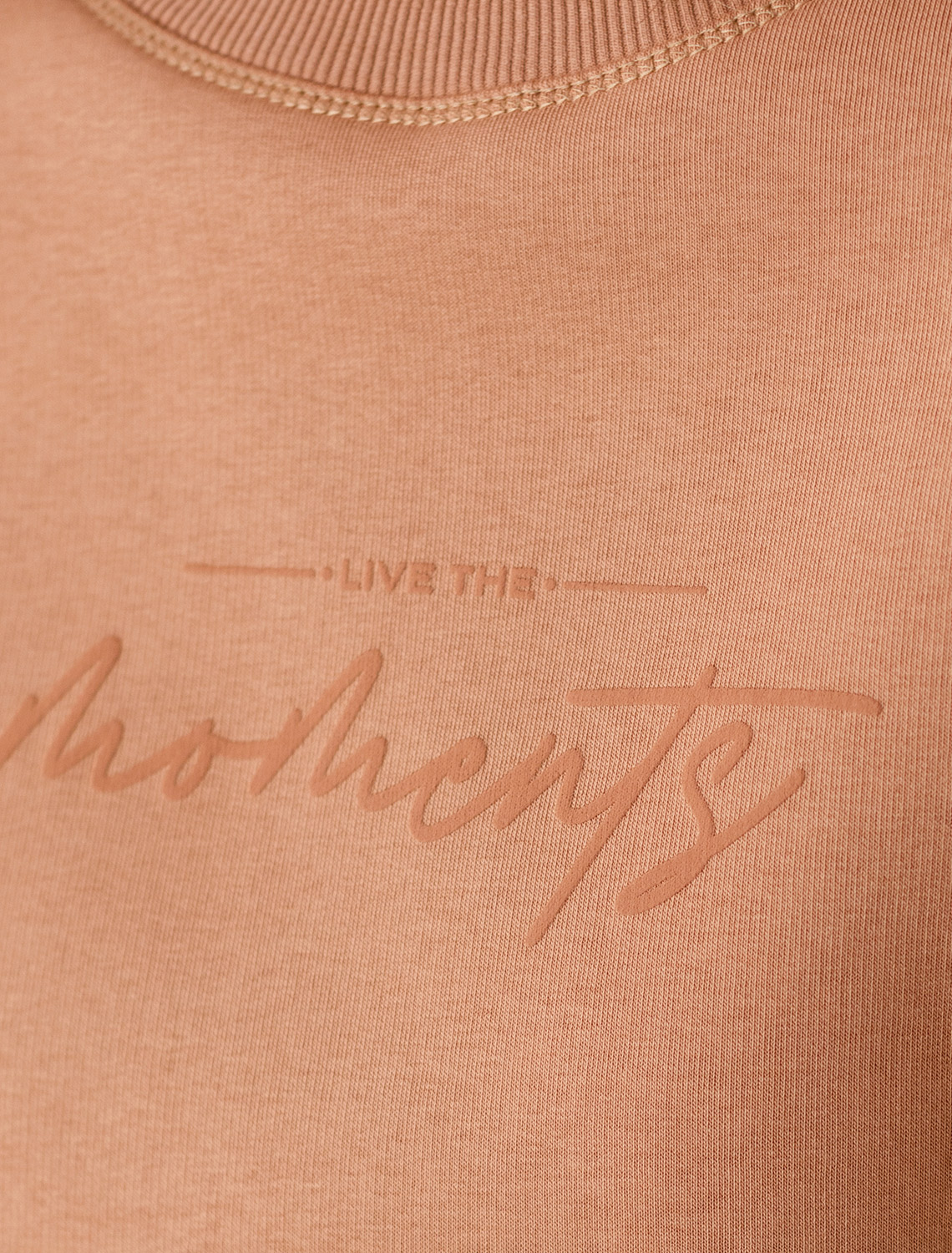 Свитшот с круглым воротом выполнен из премиального футера трехнитки с теплым начесом. Модель дополнена фактурным лаконичным принтом. Перевод: «Живи мгновениями». Свободный крой подходит для любой фигуры и впишется в любой гардероб. Сочетается в костюме с брюками D44.129 охра_moments