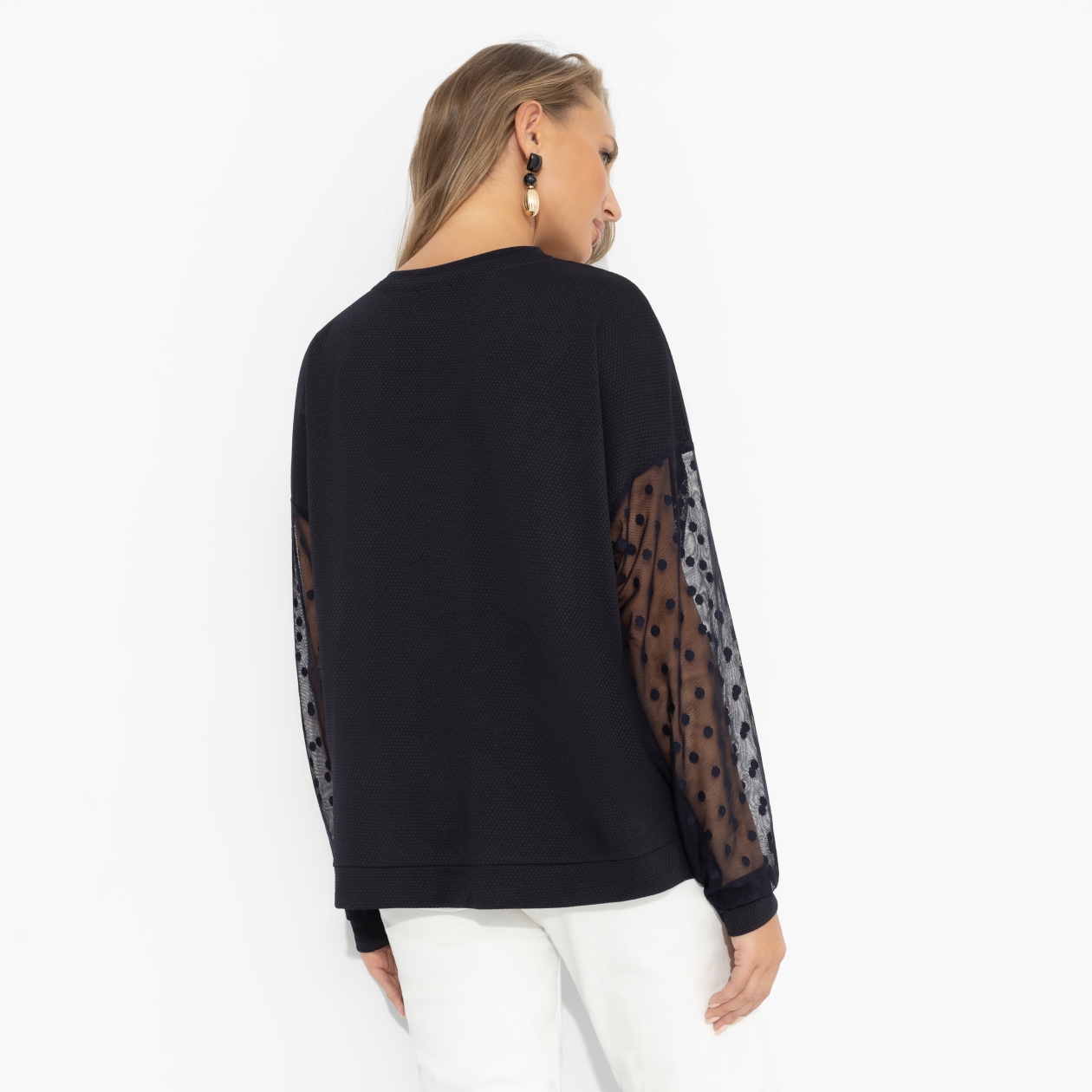 Женственность – не про каблуки и вечерние платья. Это про мягкость движений, уверенность в каждом взгляде и способность быть собой даже в повседневности. Свитшот словно создан для того, чтобы подчеркнуть природное обаяние и лёгкость. Свитшот прямого силуэта с игрой фактур: плотный трикотаж двух видов гармонично сочетается с полупрозрачной сеткой в горох. Комфортный, стильный вариант для образов на каждый день.