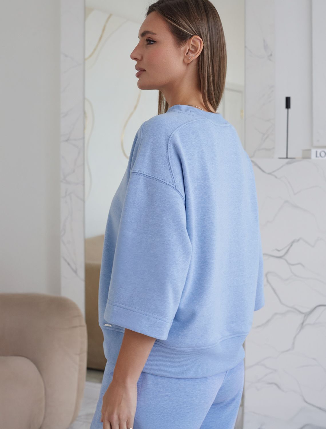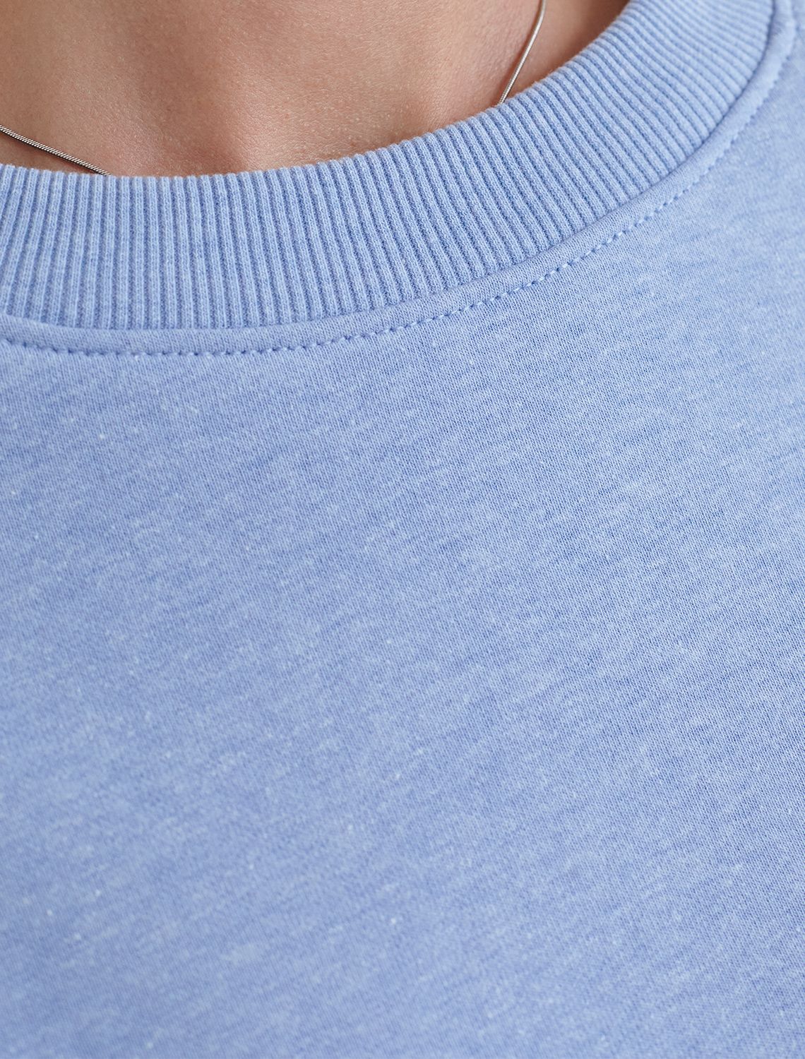 Свободный свитшот голубого цвета с эффектом меланж выполнен из мягкого петельчатого футера двухнитки с добавлением эластана, что обеспечивает комфортную посадку и комфорт. Материал отличается мягкостью и приятной текстурой, позволяя коже дышать и обеспечивая максимальное удобство при носке, а так же хорошей износостойкостью и сохраняет форму даже после многочисленных стирок. Круглый ворот и широкие рукава средней длины придают свитшоту стильный и современный вид и делают образ расслабленным и непринужденным, такой вариант отлично сядет на большие размеры, подчеркивая достоинства фигуры. .Джемпер идеально подходит для повседневной носки и отлично подойдет тем, кто ценит удобство и свободу движений без компромиссов по стилю. Этот свитшот станет отличным выбором в прохладную погоду в комплекте с бомбером D49,141 или уютным дополнением к домашнему образу в комплекте с брюками D44.157