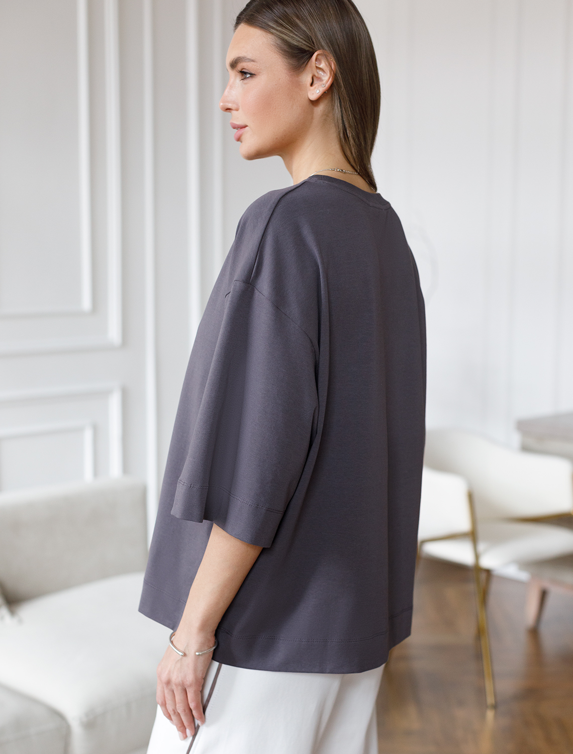 Футболка свободной формы выполнена из эластичного хлопка. Самые мягкие волокна премиального хлопка гарантируют непревзойденный комфорт в течении всего дня. Эластан в составе изделия, поддерживает форму и препятствует сминаемости. Хорошо сочетается с леггинсами D44.131, брюками D44.120 и шортами D48.007 темно-серый