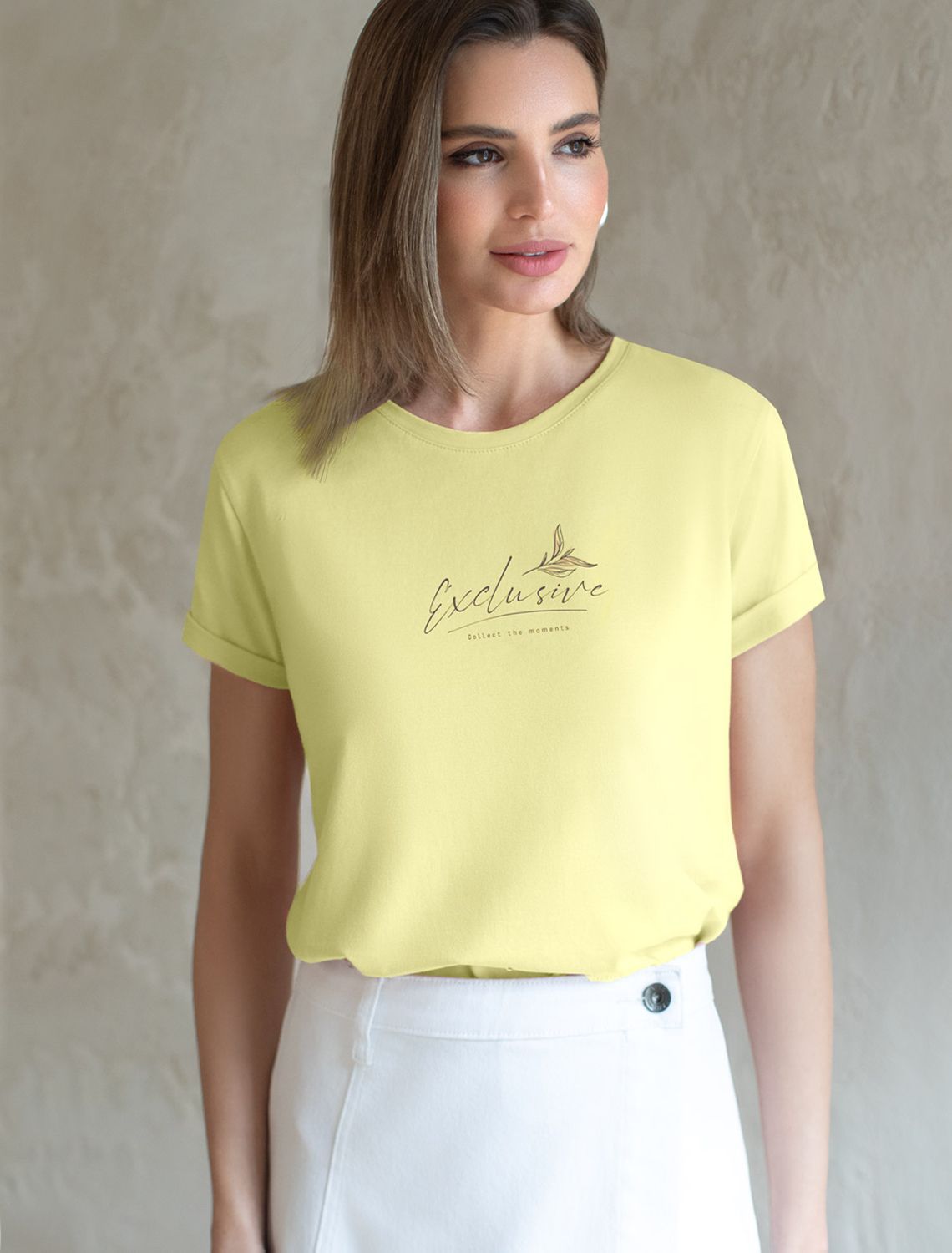 Модная футболка лимонного цвета привлекает внимание своим интересным дизайном и ярким принтом. Благодаря прямому крою изделие комфортно садится на любую фигуру, в том числе на большие размеры, и не сковывает движений. Круглый вырез подчеркивает современный стиль, а натуральный материал из хлопка с добавлением эластана обеспечивает удобство в повседневной носке и приятные тактильные ощущения. Прочность и износостойкая структура сохраняет первоначальную форму футболки после множества стирок. Рукава имеют аккуратные подгибы, что придает изделию завершенность и помогает сохранять аккуратный внешний вид. Принт надписи нанесен красками с устойчивым покрытием, перевод надписи: Exluzive moments collection only - Только коллекция эксклюзивных моментов. Стильная футболка гармонично вписывается в любой гардероб и подойдет для прогулок, отдыха дома или неформальных встреч. Благодаря особенностям кроя модель хорошо сидит, скрывая недостатки и подчеркивая достоинства. Удобная футболка идеально сочетается с базовыми вещами, позволяя создавать новые интересные образы каждый день. лимонный_exclusive