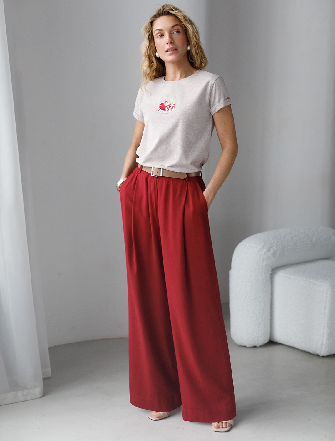 Модная футболка кофейного цвета привлекает внимание своим интересным дизайном и ярким принтом. Благодаря прямому крою изделие комфортно садится на любую фигуру, в том числе на большие размеры, и не сковывает движений. Круглый вырез подчеркивает современный стиль, а натуральный материал из хлопка с добавлением эластана обеспечивает удобство в повседневной носке и приятные тактильные ощущения. Прочность и износостойкая структура сохраняет первоначальную форму футболки после множества стирок. Рукава имеют аккуратные подгибы, что придает изделию завершенность и помогает сохранять аккуратный внешний вид. Принт в виде фрукта гранат нанесен красками с устойчивым покрытием. Стильная футболка гармонично вписывается в любой гардероб и подойдет для прогулок, отдыха дома или неформальных встреч. Благодаря особенностям кроя модель хорошо сидит, скрывая недостатки и подчеркивая достоинства. Удобная футболка идеально сочетается с базовыми вещами, позволяя создавать новые интересные образы каждый день.
