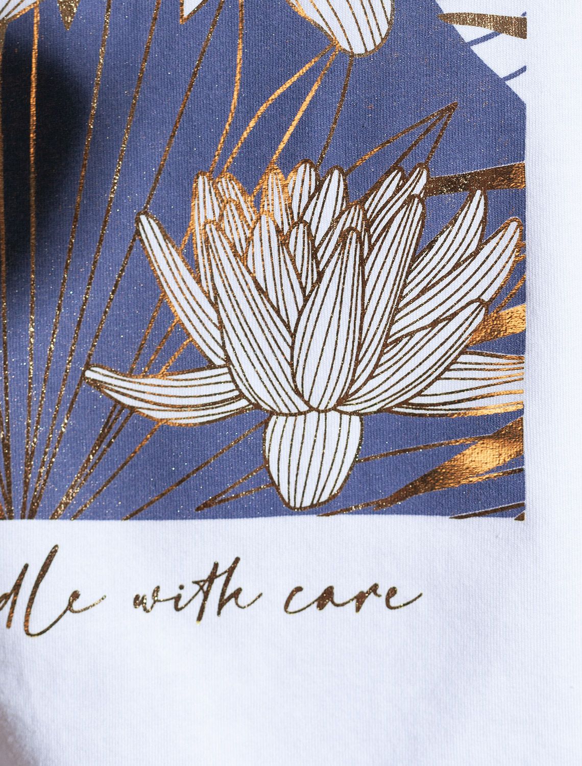 Модная футболка белого цвета привлекает внимание своим интересным дизайном и ярким принтом. Благодаря прямому крою изделие комфортно садится на любую фигуру, в том числе на большие размеры, и не сковывает движений. Круглый вырез подчеркивает современный стиль, а натуральный материал из хлопка с добавлением эластана обеспечивает удобство в повседневной носке и приятные тактильные ощущения. Прочность и износостойкая структура сохраняет первоначальную форму футболки после множества стирок. Рукава имеют аккуратные подгибы, что придает изделию завершенность и помогает сохранять аккуратный внешний вид. Принт в виде цветов и надписи нанесен красками с устойчивым покрытием, перевод надписи: Handle with care - Обращаться с осторожностью. Стильная футболка гармонично вписывается в любой гардероб и подойдет для прогулок, отдыха дома или неформальных встреч. Благодаря особенностям кроя модель хорошо сидит, скрывая недостатки и подчеркивая достоинства. Удобная футболка идеально сочетается с базовыми вещами, позволяя создавать новые интересные образы каждый день.