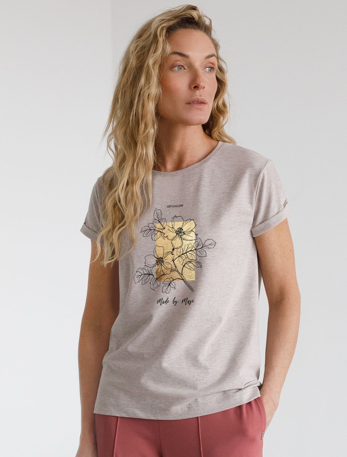 Модная футболка кофейного цвета привлекает внимание своим интересным дизайном и ярким принтом. Благодаря прямому крою изделие комфортно садится на любую фигуру, в том числе на большие размеры, и не сковывает движений. Круглый вырез подчеркивает современный стиль, а натуральный материал из хлопка с добавлением эластана обеспечивает удобство в повседневной носке и приятные тактильные ощущения. Прочность и износостойкая структура сохраняет первоначальную форму футболки после множества стирок. Рукава имеют аккуратные подгибы, что придает изделию завершенность и помогает сохранять аккуратный внешний вид. Принт в виде цветов и надписи нанесен красками с устойчивым покрытием, перевод надписи: Art gallery made by muse - Художественная галерея, созданная музой. Стильная футболка гармонично вписывается в любой гардероб и подойдет для прогулок, отдыха дома или неформальных встреч. Благодаря особенностям кроя модель хорошо сидит, скрывая недостатки и подчеркивая достоинства. Удобная футболка идеально сочетается с базовыми вещами, позволяя создавать новые интересные образы каждый день.