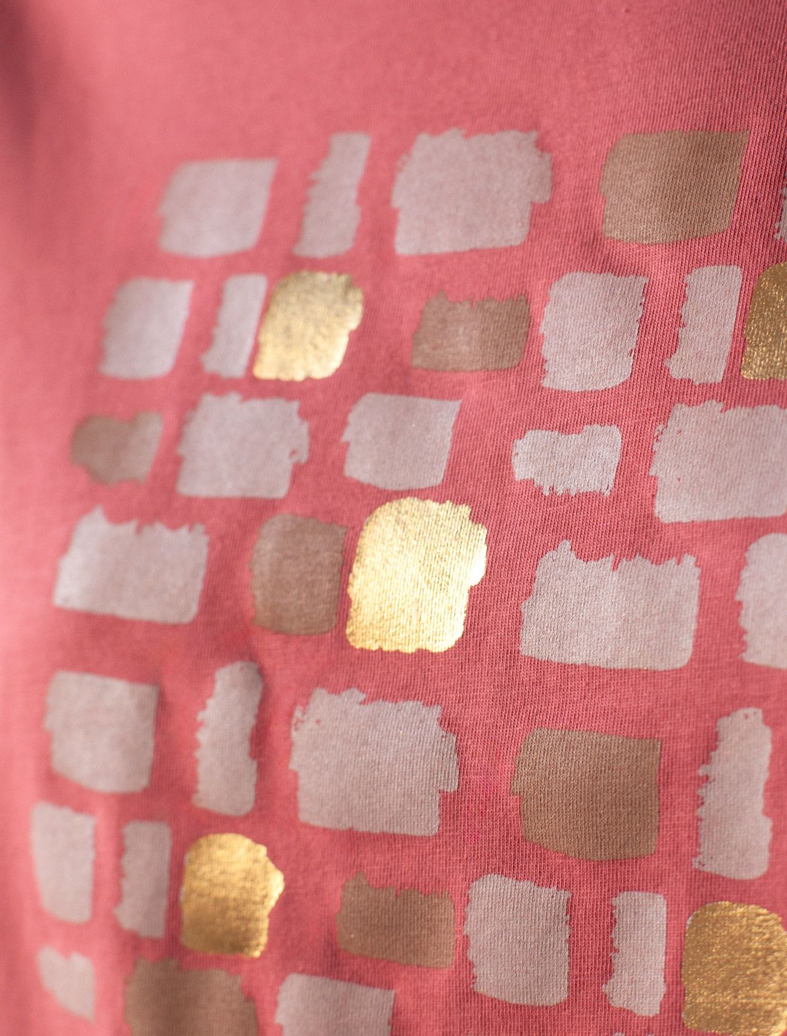 Модная футболка темно-кораллового цвета привлекает внимание своим интересным дизайном и ярким принтом. Благодаря прямому крою изделие комфортно садится на любую фигуру, в том числе на большие размеры, и не сковывает движений. Круглый вырез подчеркивает современный стиль, а натуральный материал из хлопка с добавлением эластана обеспечивает удобство в повседневной носке и приятные тактильные ощущения. Прочность и износостойкая структура сохраняет первоначальную форму футболки после множества стирок. Рукава имеют аккуратные подгибы, что придает изделию завершенность и помогает сохранять аккуратный внешний вид. Принт в виде бликов нанесен золотистыми красками с устойчивым покрытием. Стильная футболка гармонично вписывается в любой гардероб и подойдет для прогулок, отдыха дома или неформальных встреч. Благодаря особенностям кроя модель хорошо сидит, скрывая недостатки и подчеркивая достоинства. Удобная футболка идеально сочетается с базовыми вещами, позволяя создавать новые интересные образы каждый день