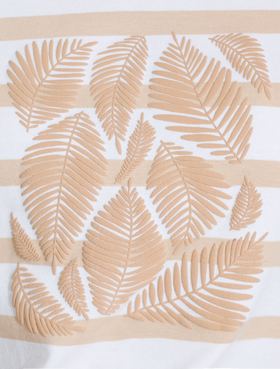 Модная футболка белого цвета в горизонтальную бежевую полоску привлекает внимание своим интересным дизайном и ярким принтом. Благодаря прямому крою изделие комфортно садится на любую фигуру, в том числе на большие размеры, и не сковывает движений. Круглый вырез подчеркивает современный стиль, а натуральный материал плотностью 170 Г/м2 из хлопка с добавлением эластана обеспечивает удобство в повседневной носке и приятные тактильные ощущения. Прочность и износостойкая структура позволяют сохранять свежий внешний вид после множества стирок. Принт в виде листиков нанесен красками с устойчивым покрытием. Стильная футболка гармонично вписывается в любой гардероб и подойдет для прогулок, отдыха или неформальных встреч. Благодаря особенностям кроя модель хорошо сидит, скрывая недостатки и подчеркивая достоинства. Яркая футболка идеально сочетается с базовыми вещами, позволяя создавать новые интересные образы каждый день.