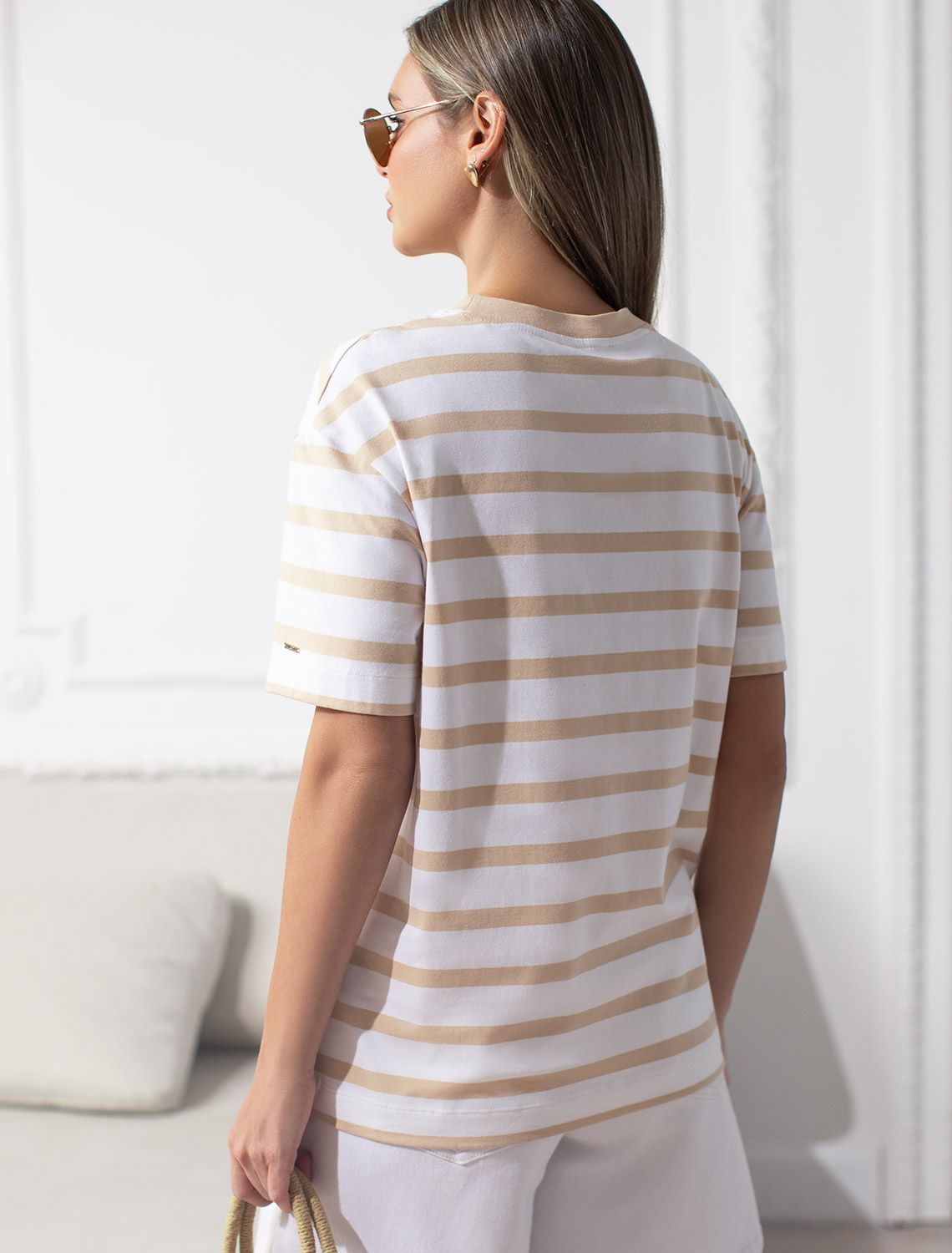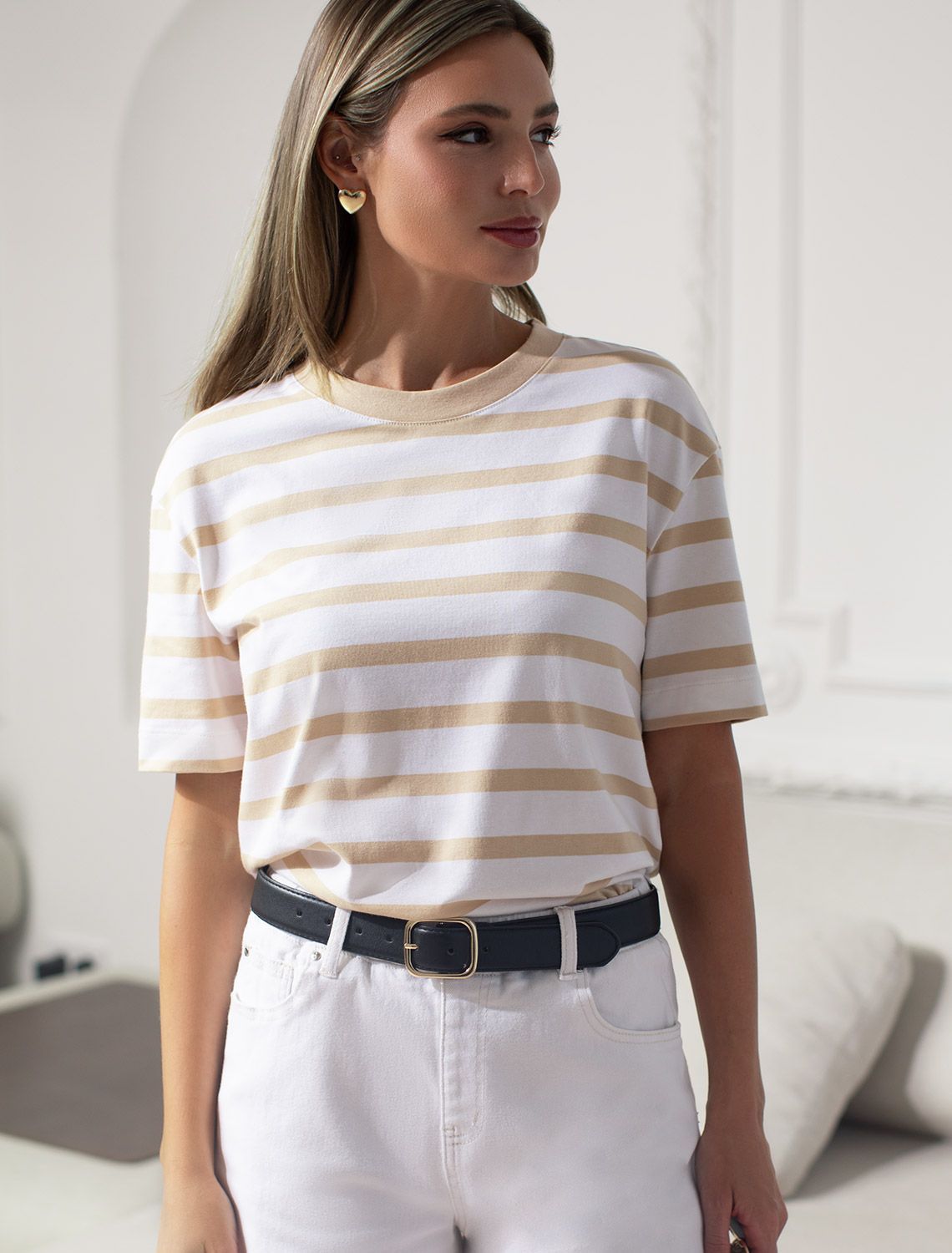 Модная футболка белого цвета в широкую горизонтальную полоску кофейного цвета привлекает внимание своим интересным дизайном. Благодаря прямому крою изделие комфортно садится на любую фигуру, в том числе на большие размеры, и не сковывает движений. Круглый вырез подчеркивает современный стиль, а натуральный материал из хлопка с добавлением эластана обеспечивает удобство в повседневной носке и приятные тактильные ощущения. Прочность и износостойкая структура позволяют сохранять свежий внешний вид после множества стирок.Стильная футболка гармонично вписывается в любой гардероб и подойдет для прогулок, отдыха или неформальных встреч. Благодаря особенностям кроя модель хорошо сидит, скрывая недостатки и подчеркивая достоинства. Футболка в полоску идеально сочетается с базовыми вещами, позволяя создавать новые интересные образы каждый день.