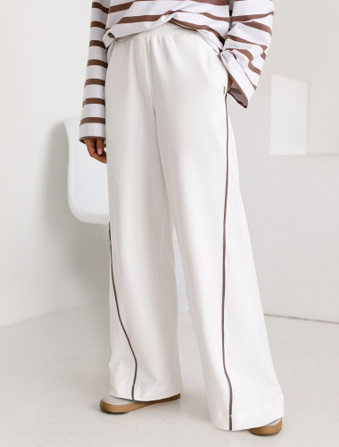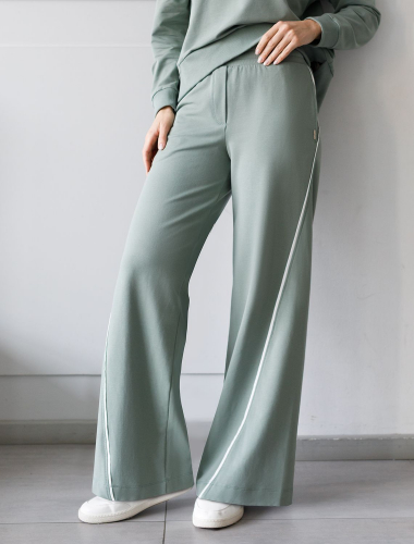 Брюки свободного кроя с контрастными лампасами выполнены из эластичного футера двухнитки. Модель дополнена боковыми карманами. Пояс на резинке фиксируется внутренним хлопковым шнуром. Диагональные визуально стройнят силуэт, а образ становится динамичным. Сочетайте изделие в костюме с паркой D49.076 и свитшотом D49.073