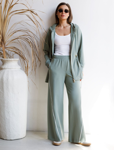 Брюки свободного кроя выполнены из эластичного футера-двухнитки. Модель дополнена защипами и боковыми карманами как у классических брюк и одним задним карманом. Эластичный пояс на резинке с шнурком из репсовой ленты и металлической фурнитурой. Брюки сочетаются в костюме с футболкой D49.085