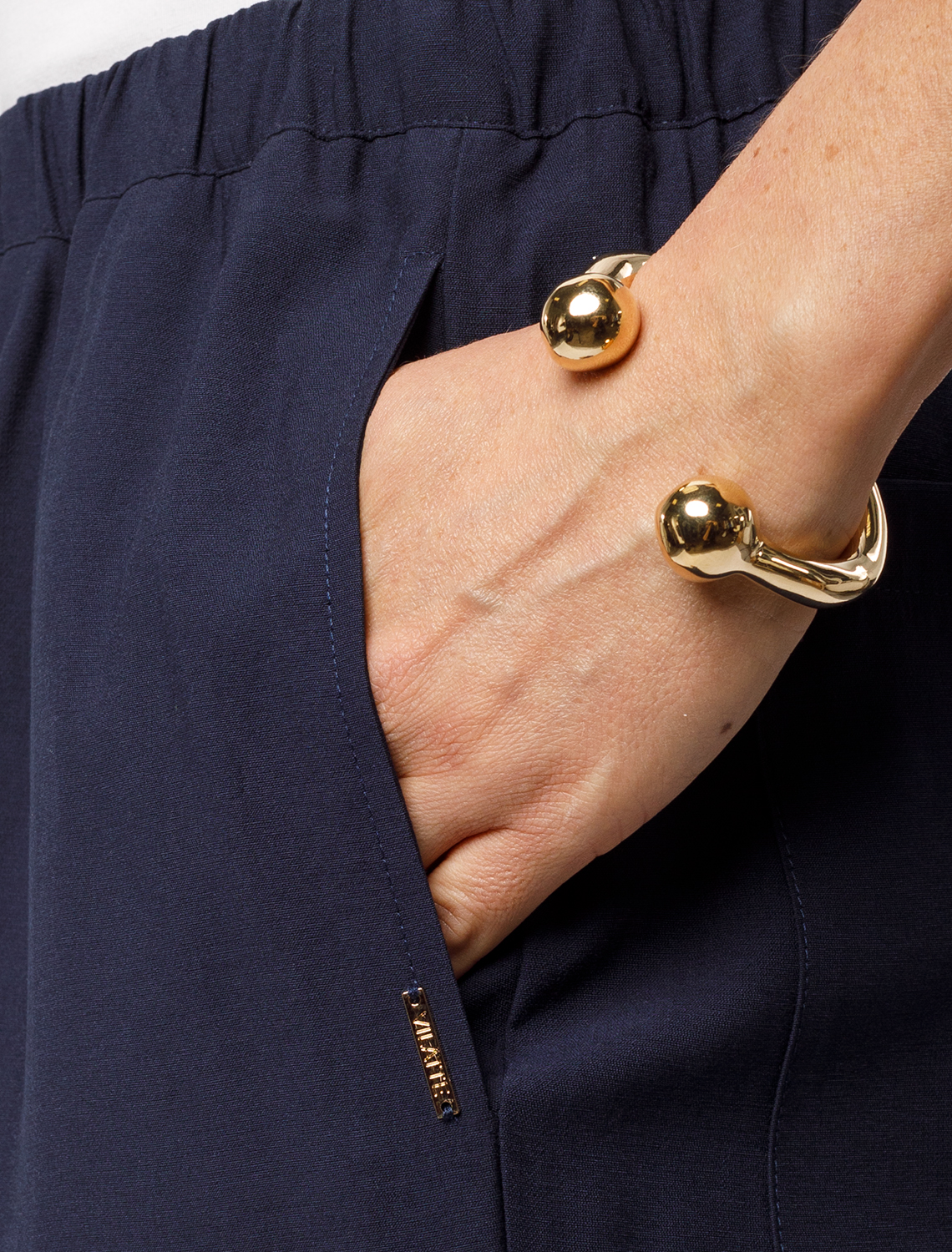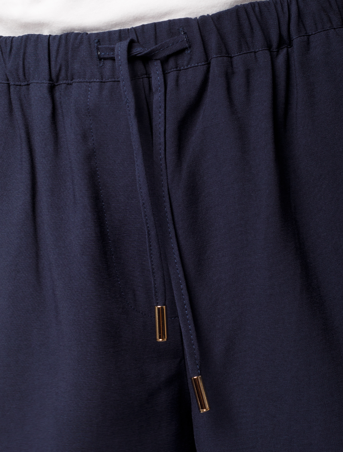 Брюки свободного кроя выполнены из плотного лиоцелла. Модель дополнена карманами и поясом с эластичной резинкой и регулируемым шнурком с золотистой фурнитурой. Ткань изделия отлично держит форму, плавно драпируется и не просвечивает. В теплое время года приятно охлаждает кожу. Добавление синтетических волокон в составе изделия, предотвращает сминаемостьи поддерживает формоустойчивость. Брюки сочетаются в костюме с топом D23.063, блузкой D29.266, D29.267 и жилетом D27.002 темно-синий