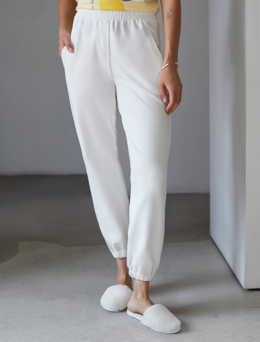 Брюки свободного кроя выполнены из эластичного футера-двухнитки. Модель дополнена защипами и боковыми карманами как у классических брюк и одним задним карманом. Эластичный пояс на резинке с шнурком из репсовой ленты и металлической фурнитурой. Брюки сочетаются в костюме с любым верхом из футера в черном цвете. черный