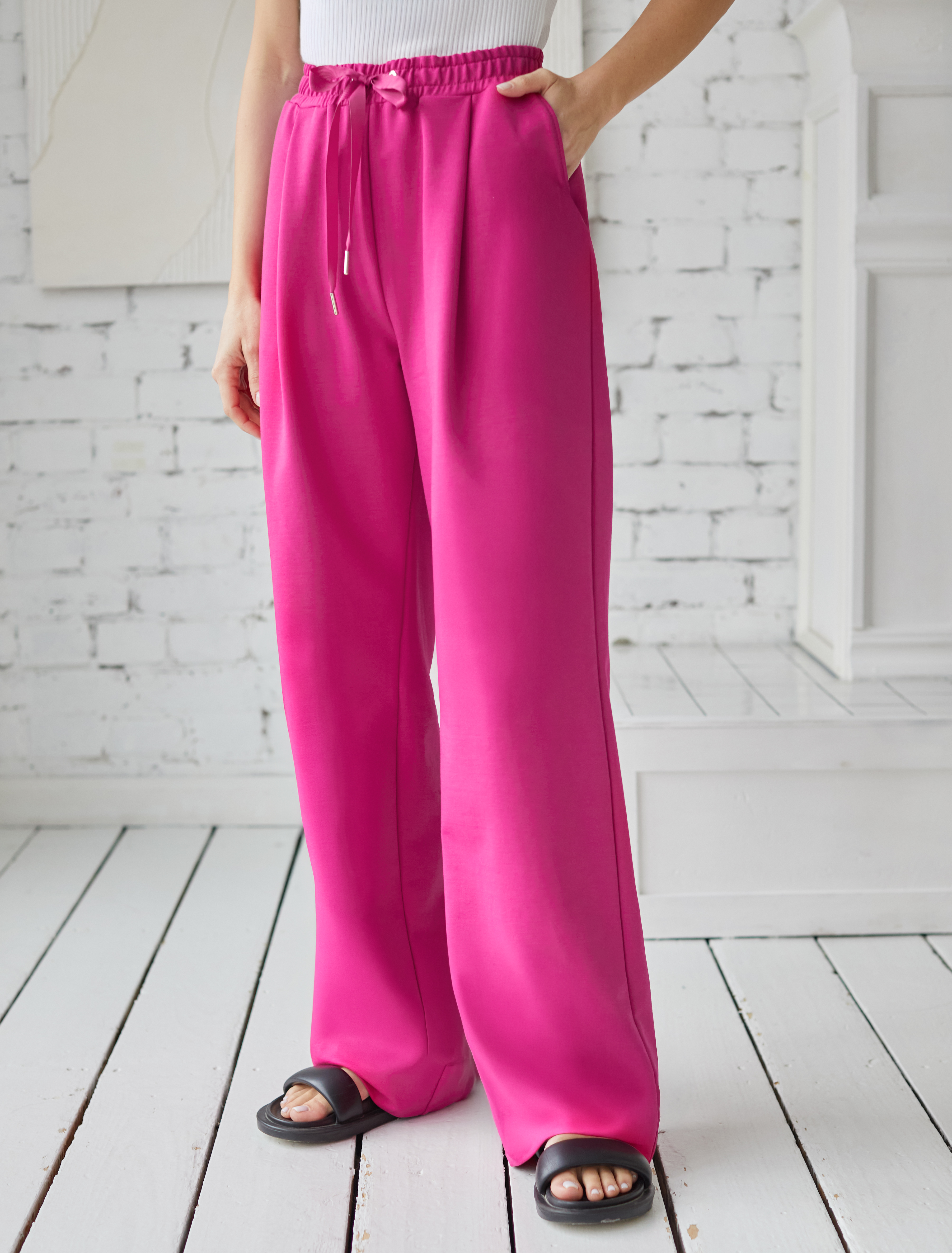 Брюки свободного кроя выполнены из эластичного футера-двухнитки. Модель дополнена защипами и боковыми карманами как у классических брюк и одним задним карманом. Эластичный пояс на резинке с шнурком из репсовой ленты и металлической фурнитурой. Брюки сочетаются в костюме с футболкой D49.085 фуксия