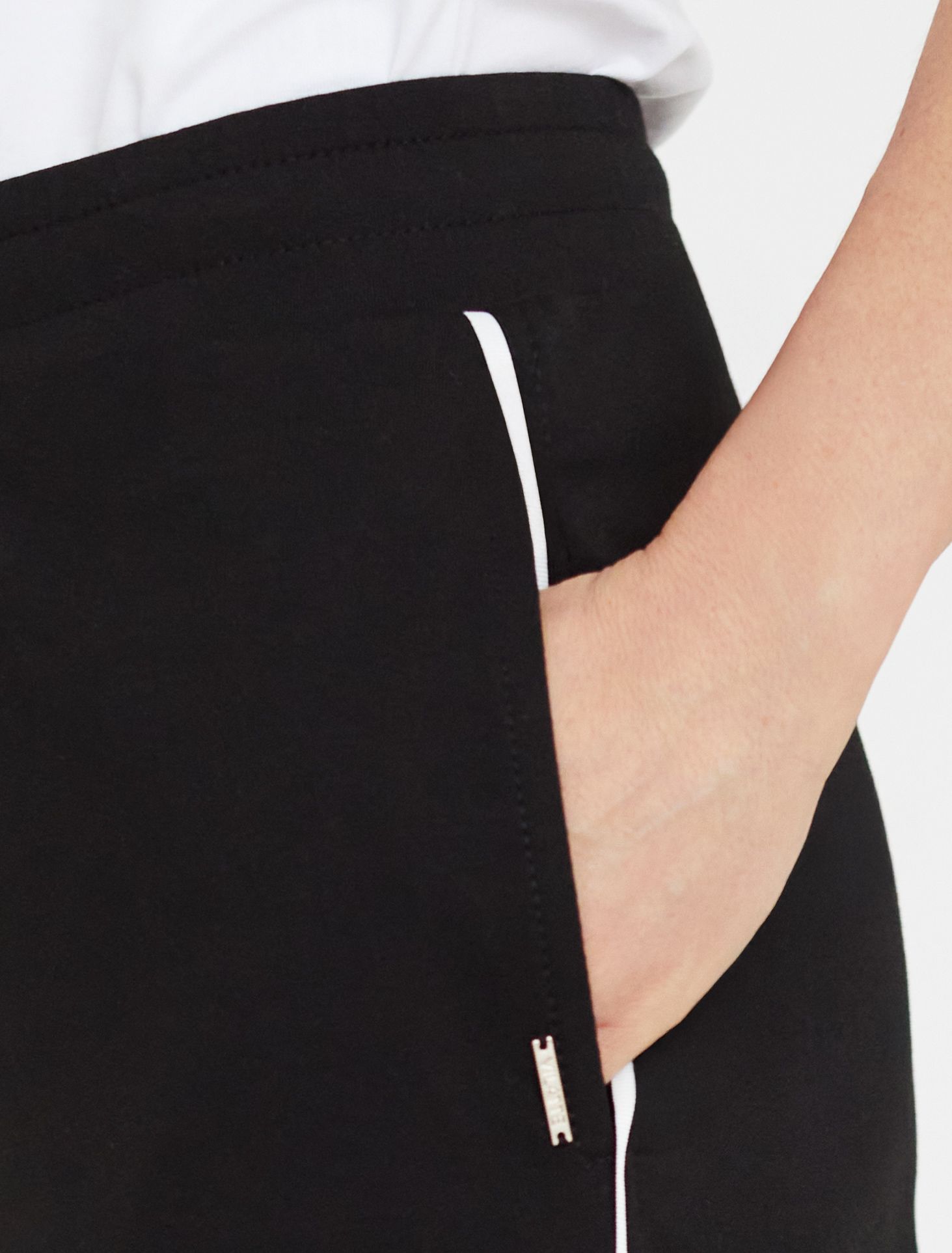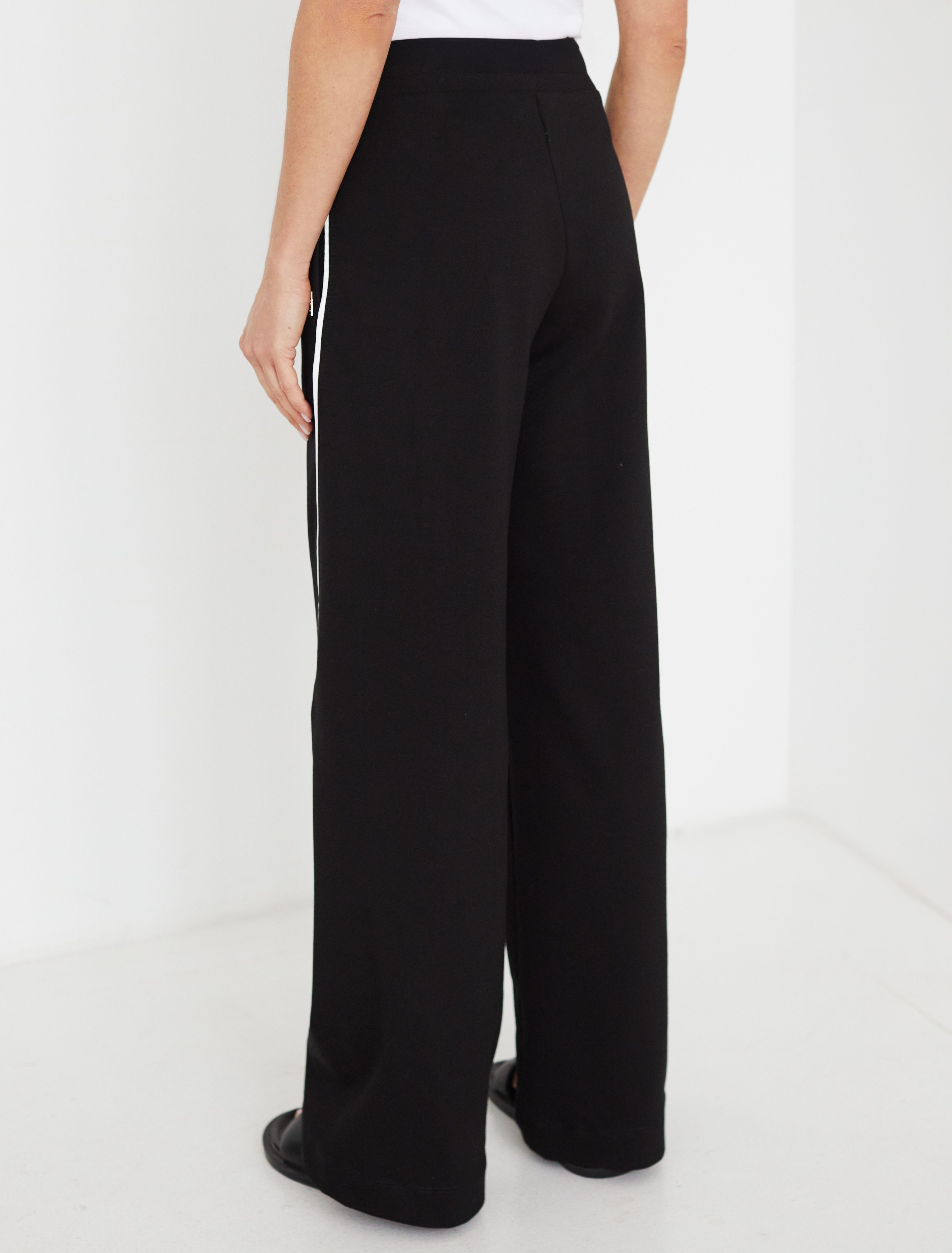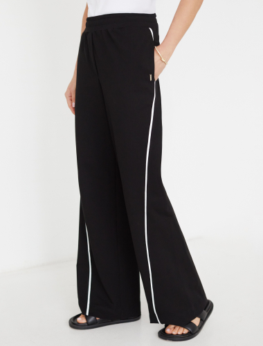 Брюки свободного кроя с контрастными лампасами выполнены из эластичного футера двухнитки. Модель дополнена боковыми карманами. Пояс на резинке фиксируется внутренним хлопковым шнуром. Диагональные визуально стройнят силуэт, а образ становится динамичным. Сочетайте изделие в костюме с паркой D49.076 и свитшотом D49.073 черный