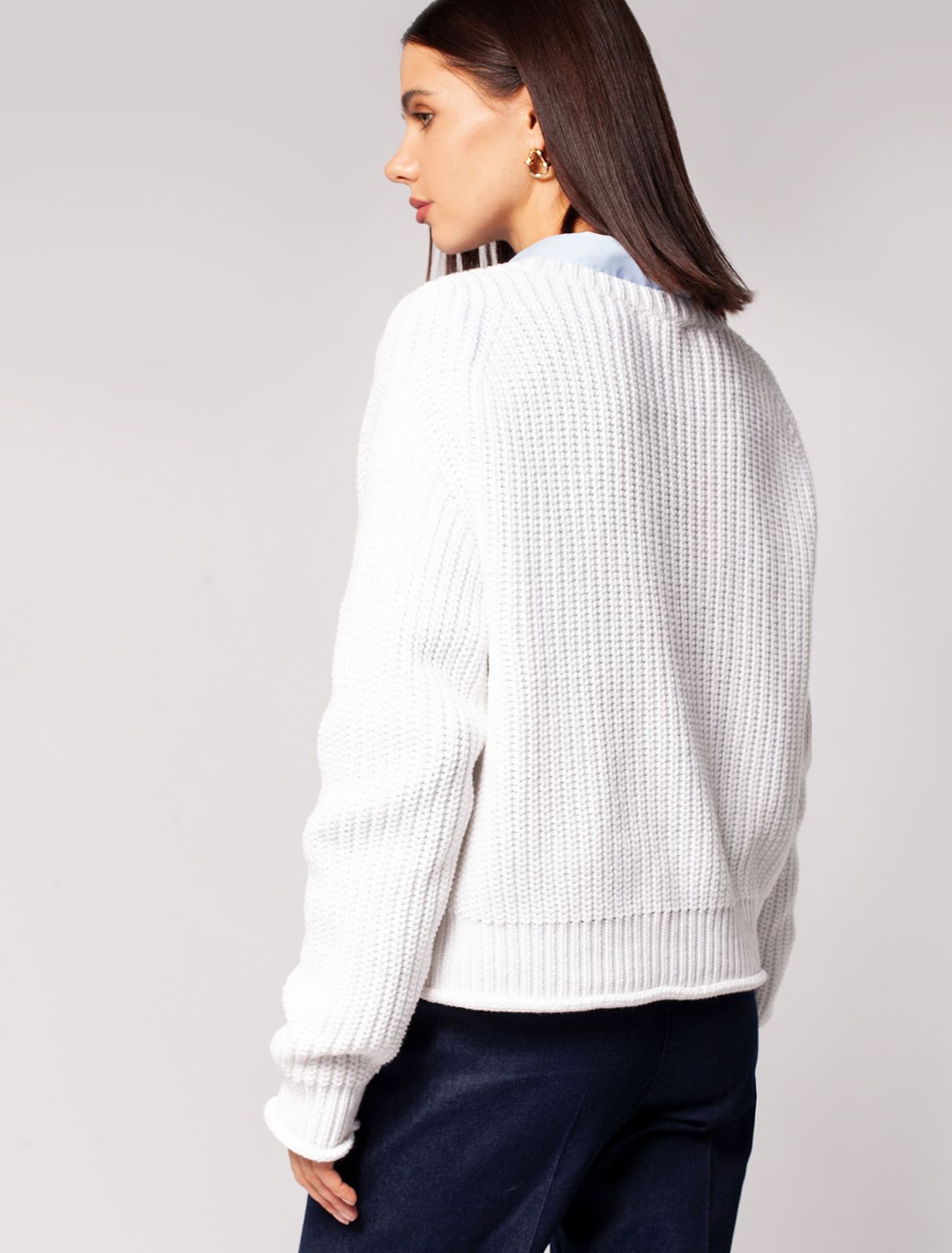 Хлопковый джемпер в снежно-белом оттенке. Модель выполнили крупной фактурной вязкой из мягкого хлопка с акрилом. Изделие из такой пряжи получилось невероятно теплым и приятным на ощупь. Подходит для любого типа фигуры и отлично сочетается с низами из денима, эко-кожи и классическими брюками. белый