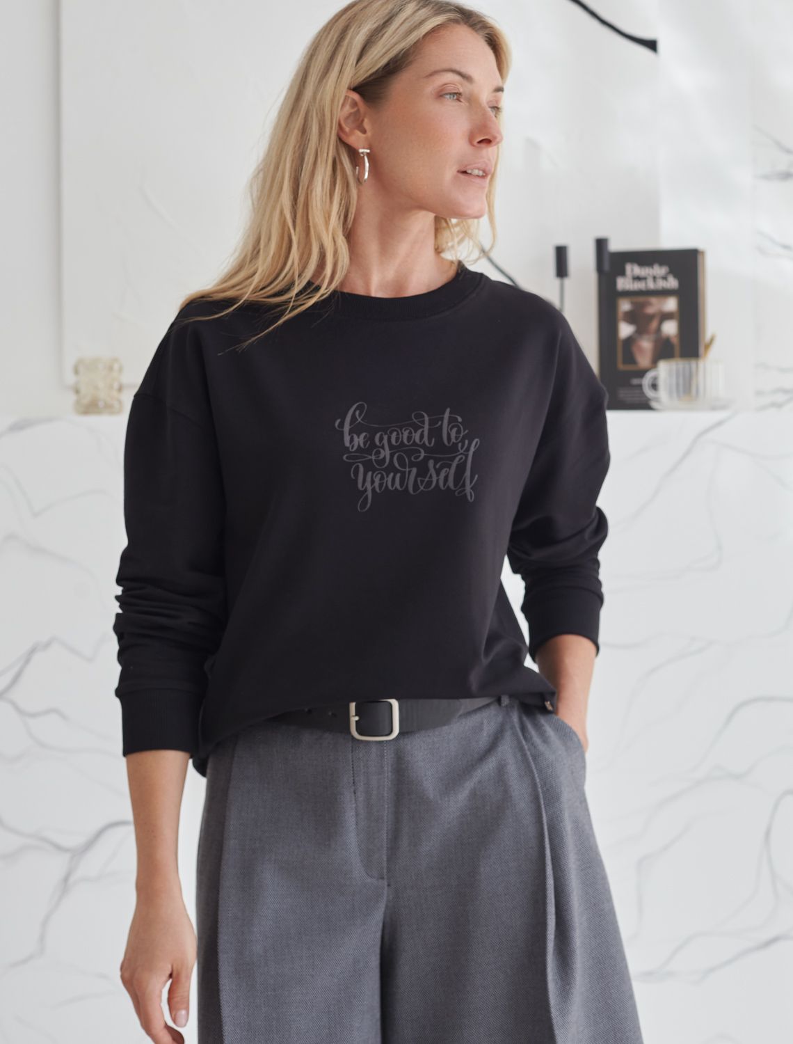 Стильный свитшот черного цвета из премиального футера двухнитки с эластаном сочетает в себе комфорт и оригинальность. Джемпер выполнен из натурального хлопка, который обеспечивает мягкость и дышащие свойства ткани. Нежный материал дарит ощущение уюта в любое время года, а премиальное качество изготовления гарантирует долговечность и сохранение формы после множества стирок. Особенность изделия — спущенная линия плеча и аккуратные разрезы, которые добавляют современный акцент и делают образ более выразительным. Принт в виде надписи придает индивидуальность, позволяя выделиться без лишней вычурности. Перевод надписи Be good Be yourself - Будь хорошей, будь собой. Дополнен металлическим логотипом бренда.