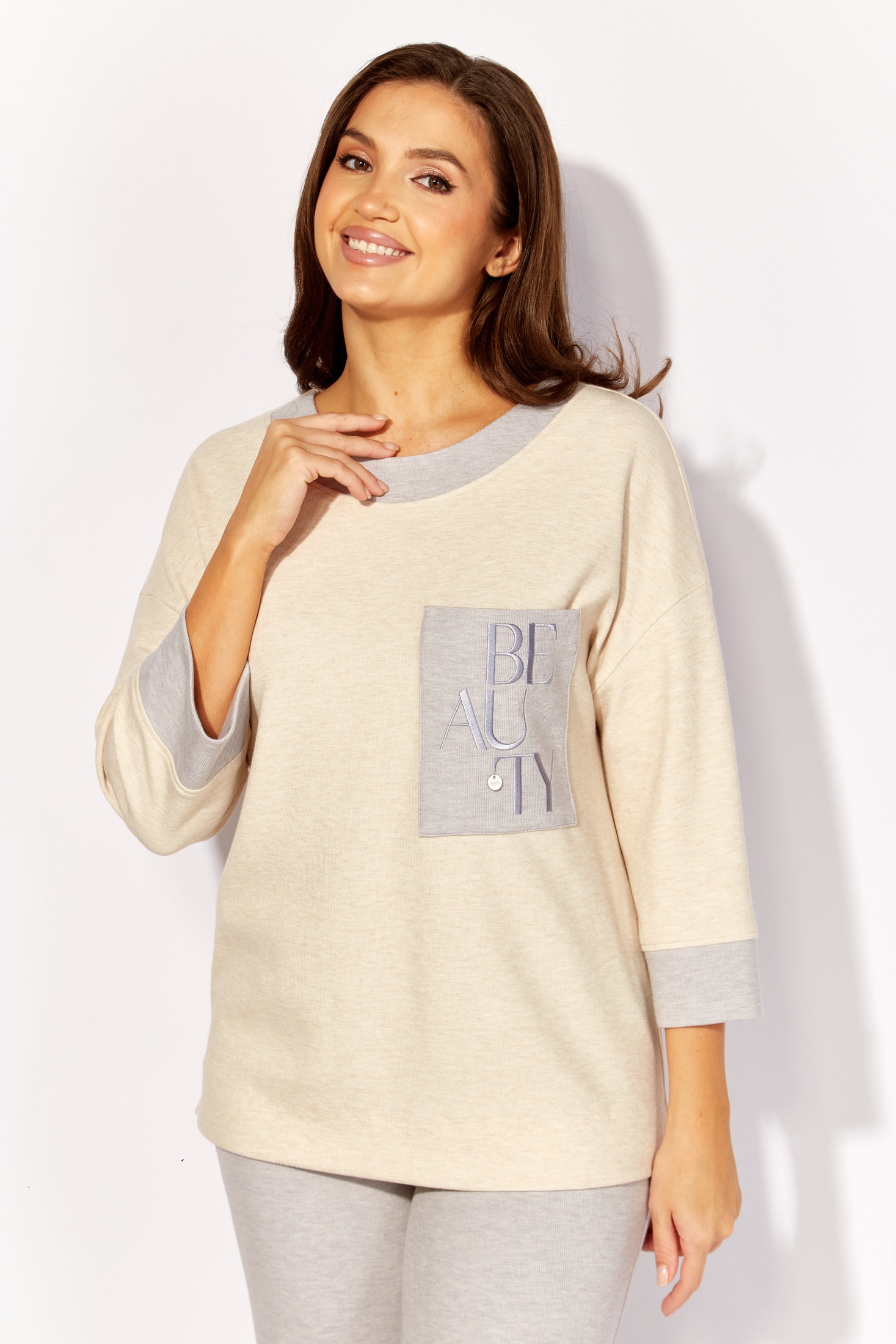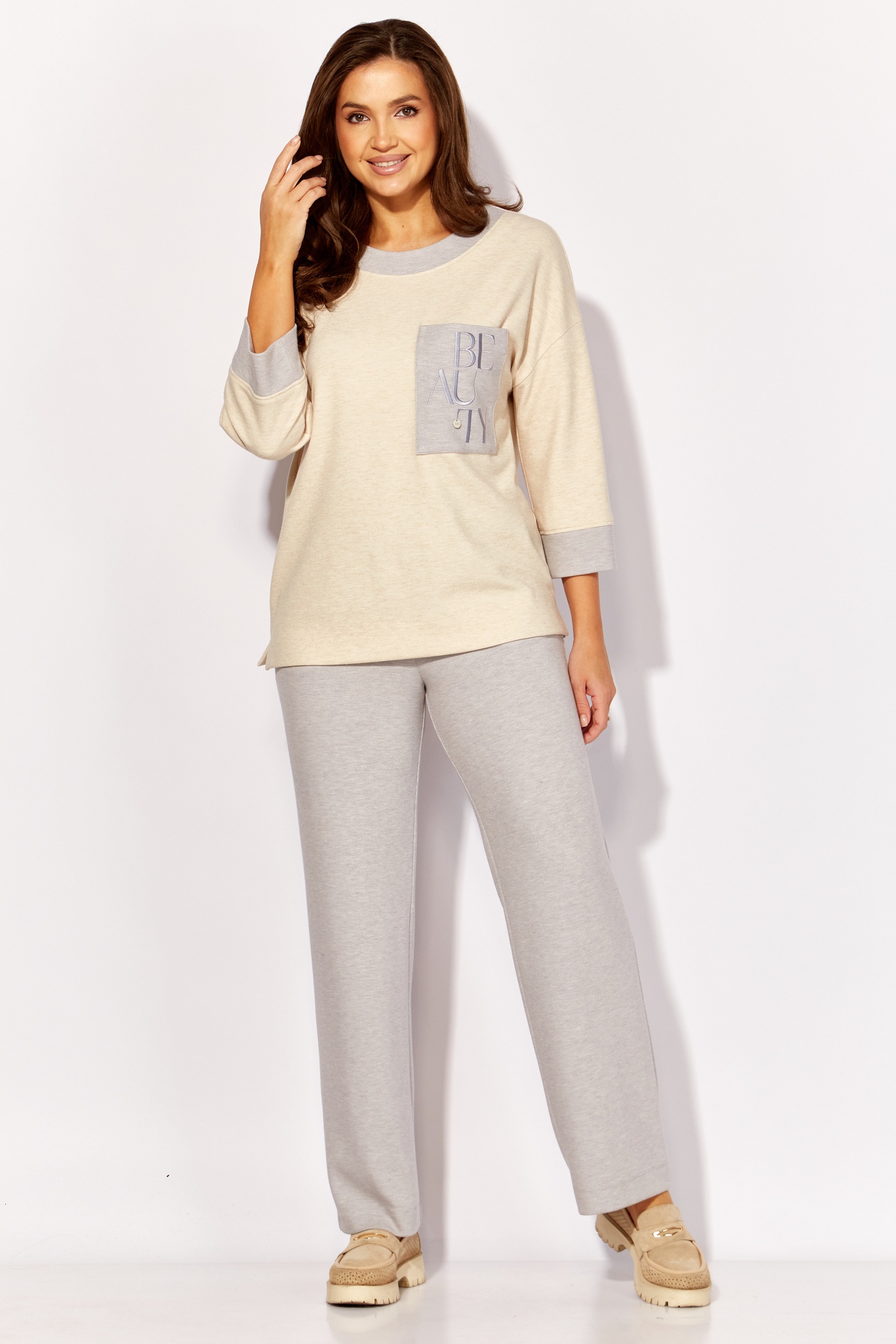 Двухкомпонентный женский костюм, идеально подходящий для создания комфортного и стильного образа. Набор включает в себя джемпер прямого силуэта с длинными рукавами 7/8 и спущенной линией плеча, завершенный отрезной манжетой. Круглая горловина с подрезной планкой добавляет изящества. Особенный акцент - накладной карман на передней части джемпера, украшенный вышивкой и принтом. Брюки прямого кроя из того же тканевого комплекта с наклонными карманами спереди обеспечивают удобство и функциональность. Пояс на резинке подчеркивает комфортность при носке. Основные цвета комплекта - нежное сочетание светло-серого и бежевого, что делает его универсальным решением для любого случая.