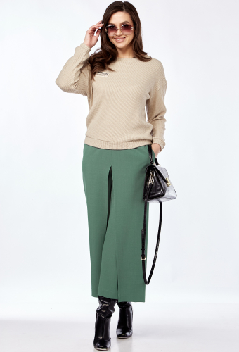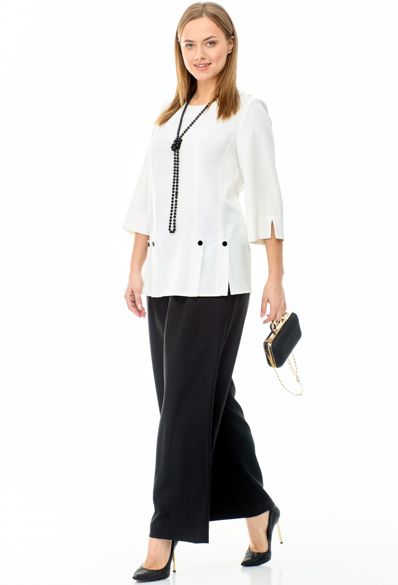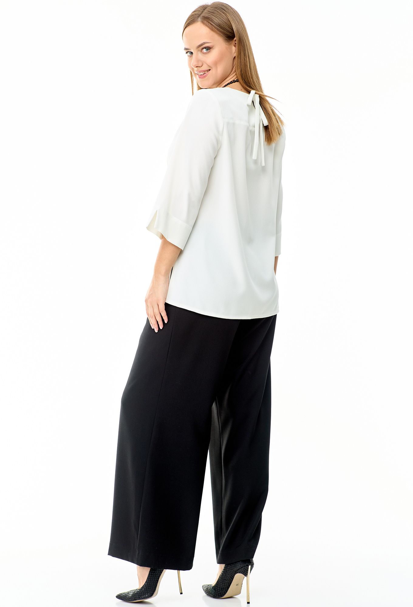 Стильный, красивый женский комплект, состоит из брюк палаццо и блузона из хлопка хорошего качества. Интересный крой блузона с двумя вертикальными линиями по переду, переходящими в разрезы с планкой и декоративными пуговичками. Рукав втачной, длина 45 см. Спинка прямая, с кокеткой и бантом сзади. Длина блузона 71 см. Брюки палаццо с 4 защипами по переду и функциональными карманами. Пояс сзади на резинке, длина брюк — 103 см. Бусы в комплект не входят.