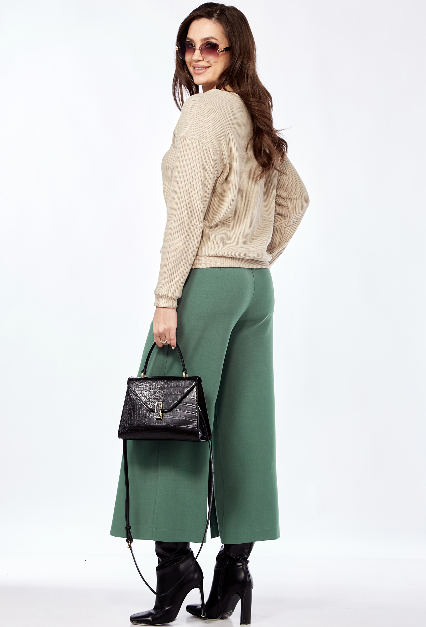 Очень элегантный женский комплект , состоит из джемпера и кюлот , из ткани хорошего качества и хорошим сочетанием цветов. Кюлоты с 2 -мя отлетными деталями , имитирующие юбку.Длина — 93 см , пояс на резинке сзади , сбоку функциональные карманы. Джемпер с очень мягенького качественного трикотажа , хорошего качества. По горловине джемпер "лодочка", прямого силуэта , со спущенной проймой , манжетами по низу и рукавам джемпера. Длина по спинке от плеча - 62 см.